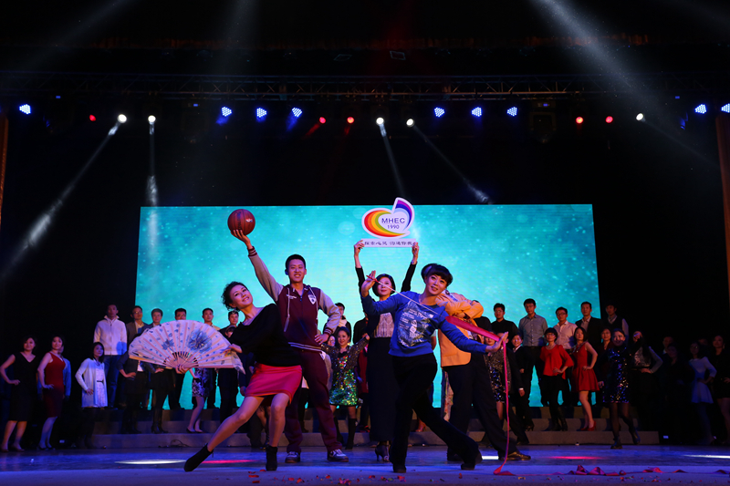 教師風采展示讓人耳目一新,來自我校各學院、部分職能部門和教輔單位的老師用形象的表演和豐富的道具表現了獨特的學院、部門文化。在動感音樂中,五名藝傳學院靚麗登場,從舞臺兩側款款走上,拉開了“教師T臺秀”的序幕,并通過攝影機、攝像機等道具展現學院教學特色;材機學院、食品學院通過“衣食住行”等表現學科與生活的密不可分;法學院教師的法官造型、“打虎拍蠅”等表演展現出學院的專業特色和依法治國的理念;機關分工會的老師在表演中以道具“新生通道”、“學生手冊”、“平安校園”等展現了學校的管理工作;后勤老師別出心裁,將一些工作用具及模板帶上舞臺,展示了多工種的風采;“愛經院愛工商”的標語表達出經濟學院教職工的愛院愛校情懷;計信學院和外語學院的教師們帶來了動感的舞蹈,儼然成了青春活力的“T臺明星”;理學院的教師手持中國結步入舞臺給人們帶來祝福;商學院的教師們精彩展示外還將寓意發展的成果“糖果”分發給大家,引燃現場;體藝部的老師們通過籃球、羽毛球、舞蹈、健美操等表演展現出我校文體教育活動的豐富多彩。圖書館的老師們將古今書典搬上舞臺,以“博覽群書”激勵同學們。燈光變幻,昔日講臺上侃侃而談的老師以另一種形式展示了教師的魅力,激起現場一陣陣掌聲,掀起了晚會的高潮。