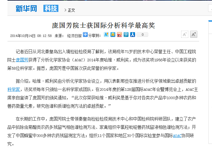 我校雙聘院士龐國芳榮獲國際分析科學最高獎哈維·威利獎,成為中國學者第一人。人民網、國家質檢總局官網、新華網、中國青年網、鳳凰網、科技日報、中國質量新聞網等多家媒體進行報道。