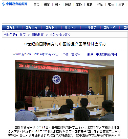 5月21日,我校首次承辦國際會議——“21世紀的國際商務與中國的復興”,共有來自15個國家的200余位專家參加會議。本次國際會議的召開,交流了國內外商務管理、經濟、跨文化等領域的最新研究成果,為我校相關學科的教師和研究人員提供了良好的國際交流平臺。中國教育新聞網、中國社會科學網等媒體記者與會并對活動進行報道,相關專業網站進行轉載。