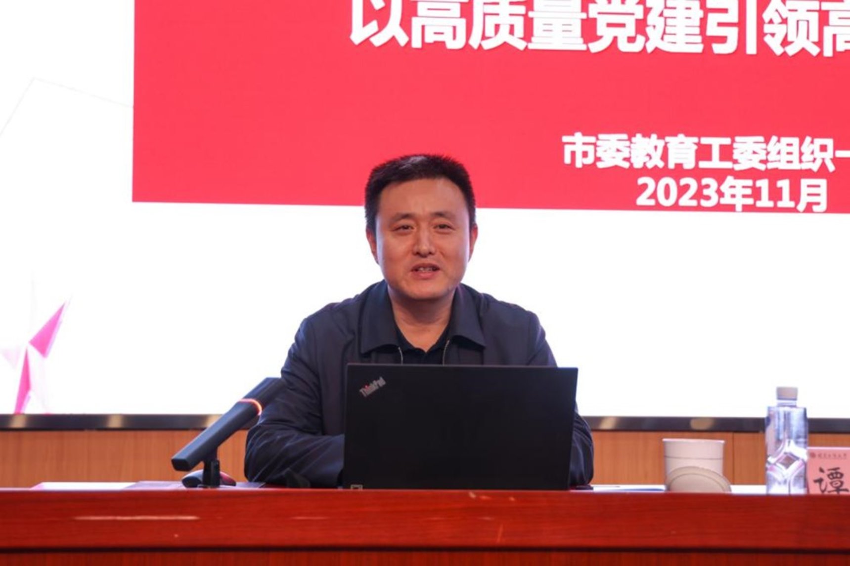 專題報告環節邀請北京市委教育工委組織一處處長譚振康作專題報告。他以《構建高質量工作體系,以高質量黨建引領高質量發展》為題,系統梳理中央對高校黨的建設的新要求,深刻分析北京高校黨建工作面臨的新形勢新任務,詳細介紹北京高校緊緊圍繞“抓好四件大事”,以高質量黨建引領高質量發展的總體思考和重要舉措,并對高校在新發展階段為什么要黨建引領、什么是黨建引領、怎么抓黨建引領進行深入講解,對堅持以習近平新時代中國特色社會主義思想為指導做好高校基層黨建工作提出明確要求。