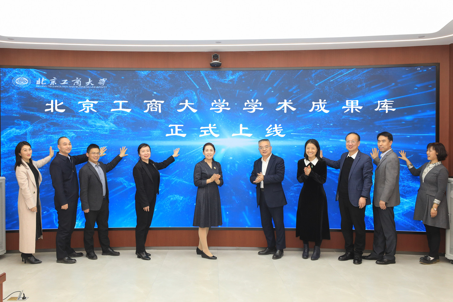 徐丹丹和委員代表共同點亮學術成果庫發布視頻,標志著“北京工商大學學術成果庫”正式上線。
