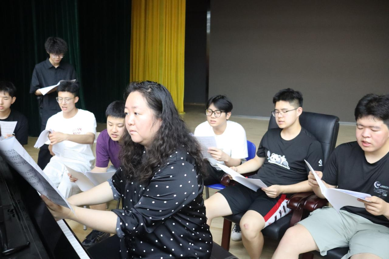 合唱訓練融入“歌聲里的抗戰故事”藝術黨課,學生們在歌聲中追憶烽火歲月,致敬偉大抗戰精神。設計與藝術學院趙夢弦老師指導學生逐字逐句打磨聲樂唱功。科學高效的體能、體態訓練計劃,確保師生在高強度排練下“身體不掉隊、精神更昂揚”。