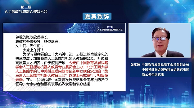 大會啟動環節由北京工商大學教授、中國教育發展戰略學會人工智能與機器人教育專業委員會常務副理事長韓力群主持。中國教育發展戰略學會常務副會長、中國常駐聯合國教科文組織代表團原公使銜副代表張雙鼓表示,人工智能作為新一輪科技革命和產業革命的重要驅動力量,正在深刻改變人們的生活、工作和教育學習方式,人工智能技術越來越多地應用在教學管理的各個環節,人工智能課程也逐漸成為重要教學內容之一,人工智能及相關專業學科的設立為現階段我國人工智能的飛躍發展提供了堅實的人才支撐。中國教育發展戰略學會人工智能與機器人教育專業委員會理事長、北京科技大學原校長張欣欣為大會總結了三大亮點:一是重磅專家解讀,攜手助力未來的人工智能與人才培養;二是聚焦人工智能素養,探索基礎教育階段課程標準化建設;三是涵蓋內容豐富,產學研協同助力人工智能教育的發展。