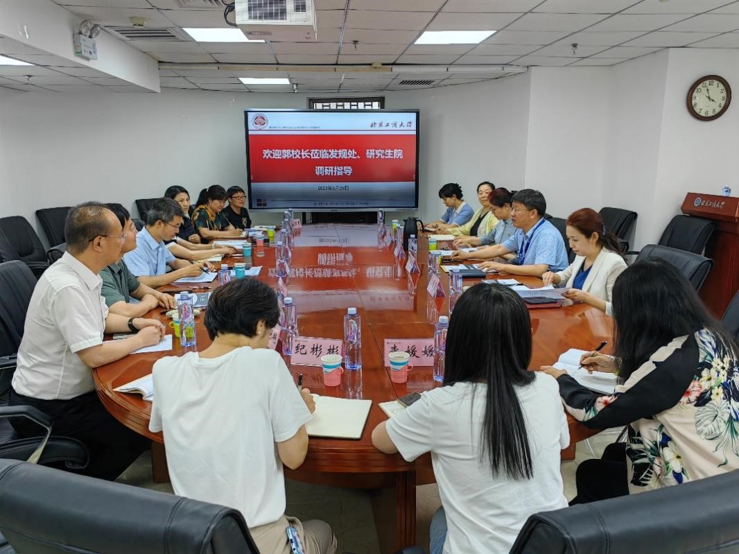 在調研職能部門時,郭建華分別聽取了學校發展規劃處、研究生院、財務處、人事處、教務處等部門的專題匯報。他強調,本科教育是大學的根和本,要堅持以生為本的培養理念,注重校園文化培育,構建三全育人格局,形成北工商學生鮮明的特質基因;高水平師資隊伍與相互協調的一流學科體系是學校高水平研究型大學建設的兩大內生動力,更是堅持“商科做強、工科做精、工商融合、雙輪驅動”的源頭活水。學校的事業發展,一方面要通過資金管理、政策導向、隊伍建設等措施,大力開源節流、降本增效,有效發揮政策導向作用,激發自籌收入動力,進一步加強績效管理,優化資源配置模式和績效管理機制,更加突出保障重點,提高資金投入效益,為學校重點工作提供財力保障;另一方面,要堅定信心加速推進學科建設和人才隊伍培養,做到“以學科引育人才,以人才帶動發展”,多維并舉加強人才引育工作,全方位培養、引進、用好人才,最終形成相互促進的良性循環,更好支撐學校事業長遠發展,助力實現特色鮮明的高水平研究型大學建設目標。