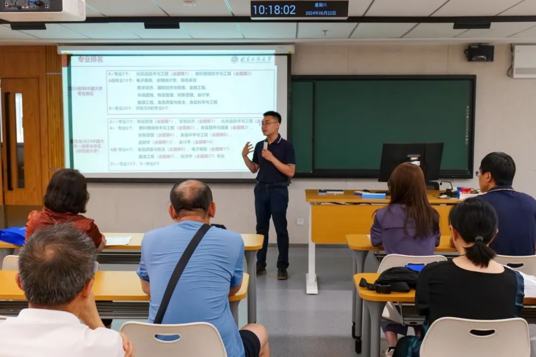 學(xué)校招生就業(yè)處副處長傅磊、本科招生辦主任卜曉媛為在場的考生和家長詳細介紹了北京工商大學(xué)的基本情況、特色專業(yè)、2024年招生計劃和報考建議,并對家長們特別關(guān)注的“優(yōu)質(zhì)專業(yè)”“升學(xué)就業(yè)”相關(guān)情況進行了講解。他們還就學(xué)校人才培養(yǎng)及畢業(yè)生就業(yè)、深造情況等方面進行了細致分享,并以學(xué)校歷年招生數(shù)據(jù)為依托,為現(xiàn)場的考生和家長們提出了合理性、專業(yè)性兼具的建議,受到了現(xiàn)場考生與家長的肯定。