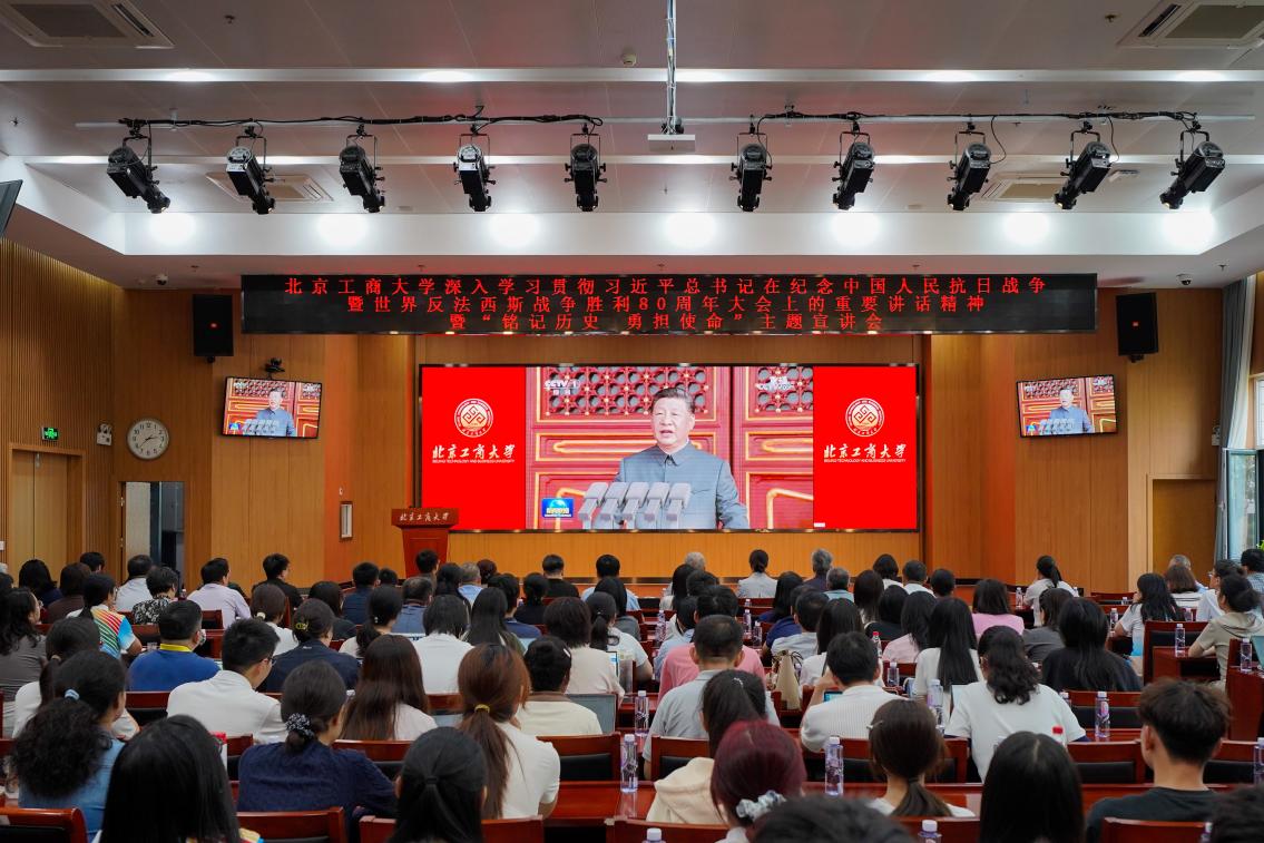 隨后,全體師生共同觀看了《銘記歷史 勇?lián)姑繁本┕ど檀髮W(xué)紀(jì)念中國(guó)人民抗日戰(zhàn)爭(zhēng)暨世界反法西斯戰(zhàn)爭(zhēng)勝利80周年專(zhuān)項(xiàng)活動(dòng)紀(jì)錄片,這部專(zhuān)題片,不僅是國(guó)家盛典的縮影,更是北工商師生參與其中所展現(xiàn)出的責(zé)任擔(dān)當(dāng)與青春風(fēng)采,為全體師生上了一堂深刻的愛(ài)國(guó)主義思政課。