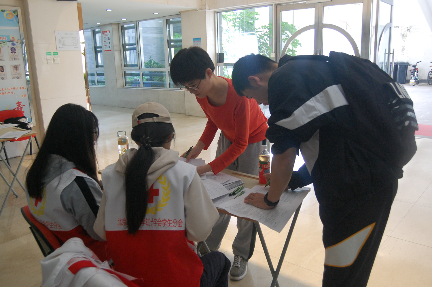 在此次活動中,在場館里穿梭的志愿者隊伍格外亮眼。他們身著統一的紅十字會志愿者馬甲,帶著親切自然的微笑,回答詢問,指引路線,搬運物資……他們使忙碌的現場井然有序,讓愛心在人與人之間傳遞,為活動更添溫情。我校紅十字會學生分會會長許嘉倫表示:“無償獻血是踐行‘奉獻、友愛、互助、進步’志愿服務精神的直接體現。作為新時代青年大學生,我們將繼續努力,讓志愿服務的旗幟在北工商飄揚”。談及對無償獻血活動的看法,許嘉倫認為:“這是一個非常有意義的志愿活動,不僅對自己的身體有益,可降低血黏稠度,促進新陳代謝。最重要的是可以為病患提供急需的鮮血,挽救他人的生命。希望有更多的老師和同學都來關心、支持無償獻血工作,讓更多的人行動起來,自愿加入無償獻血的行列中。”