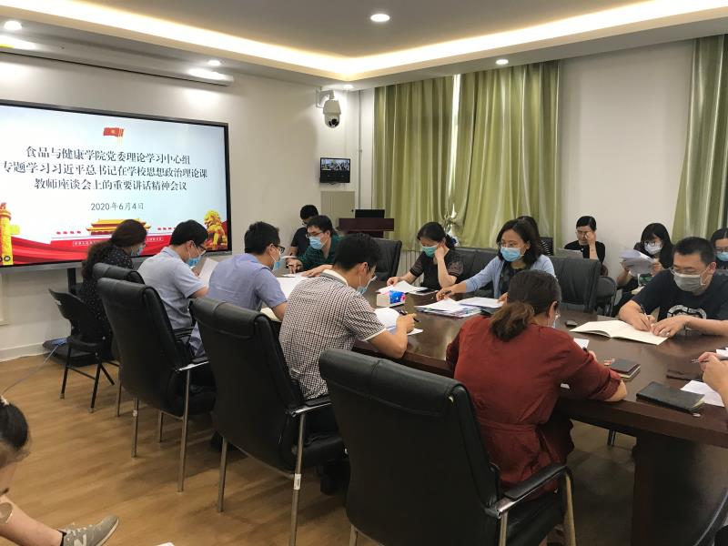 6月4日下午,食品與健康學院黨委理論學習中心組(擴大)召開學習習近平總書記在學校思想政治理論課教師座談會上重要講話精神專題會議。學院黨委理論中心組全體成員、系主任、教師代表、輔導員、辦公室老師等20余人參加。會議由學院黨委書記胡燕霞主持。