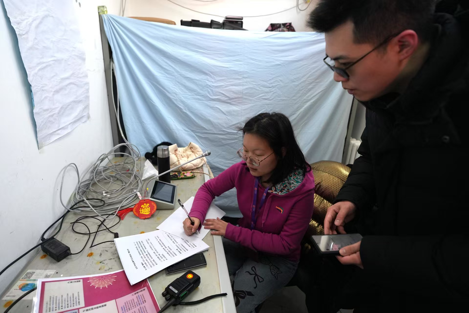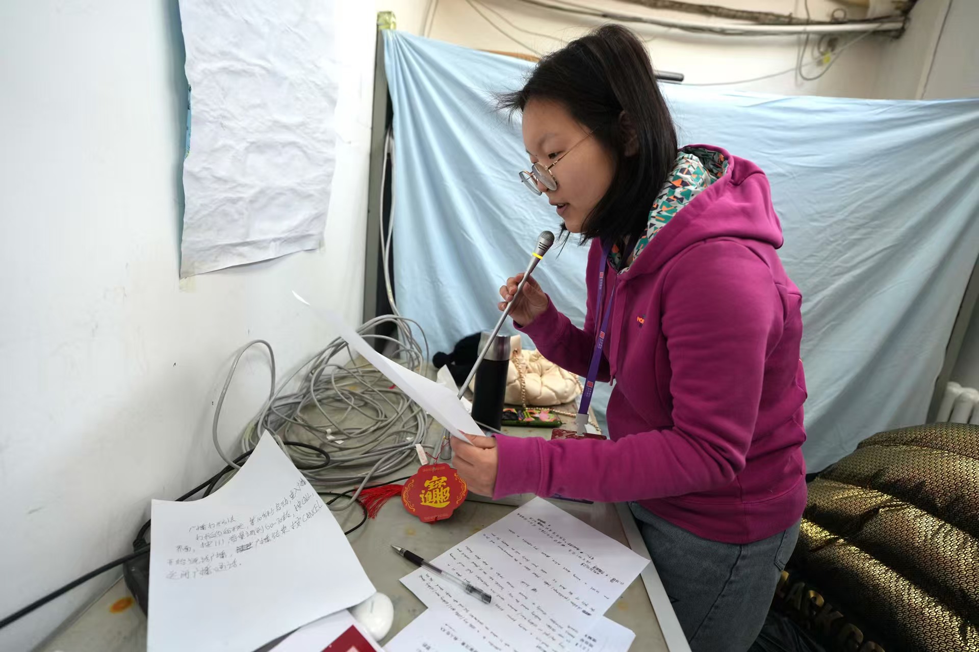 春節(jié)假期,賈雨涵天天“上班”。每天廟會開門前,她就會走進地壇公園廣播室,為當(dāng)天的工作做準(zhǔn)備。屋子里,一張桌子、一支話筒,還有一張密密麻麻寫著各類廣播注意事項的紙。