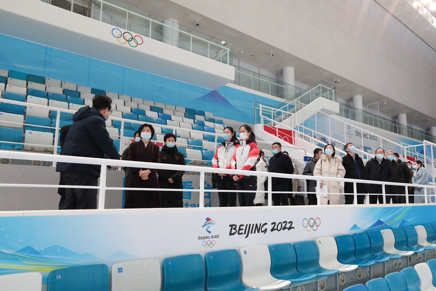 孫梅君部長一行參觀了國家游泳中心比賽大廳,場館主任張杰從場館水冰轉換、志愿者基本情況和防疫三個方面做了重點介紹,孫梅君部長與我校在現場服務的志愿者進行了互動。