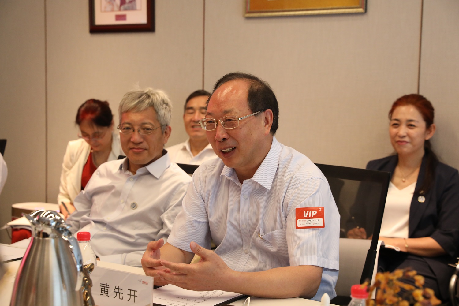 參觀結束后,雙方進行了座談交流。黨委書記黃先開就調研學習的安排作簡要說明,并詳細介紹了學校近年來的建設發展情況和當前學校的重點工作。他指出,近年來,學校在北京市委市政府的堅強領導和支持下,各項事業發展迅速,不斷邁上新的臺階,構建并形成了與具有商科、輕工和食品特色的高水平研究型大學相協調的一流學科體系。學校明確提出,要加快“雙一流”建設,舉全校之力推動食品科學與工程學科進入全國前三名、成為世界一流學科,同時,加速商科數字化轉型,滿足北京城市建設對“數字+商科”復合型創新人才的需要,進入全國一流經管學科行列。他表示,京東是知名大型民營企業,在零售等行業領域成果斐然。徐雷作為學校杰出校友代表,擔任京東集團首席執行官,母校為此感到驕傲。在學校改革發展的關鍵時期,希望雙方加強校企合作,借助京東零售、物流與消費數據的優勢,推動學校學科與科研實現跨越式發展,更好服務北京需求,也歡迎京東資深高管為學生提供多種形式的講座與實踐機會。
