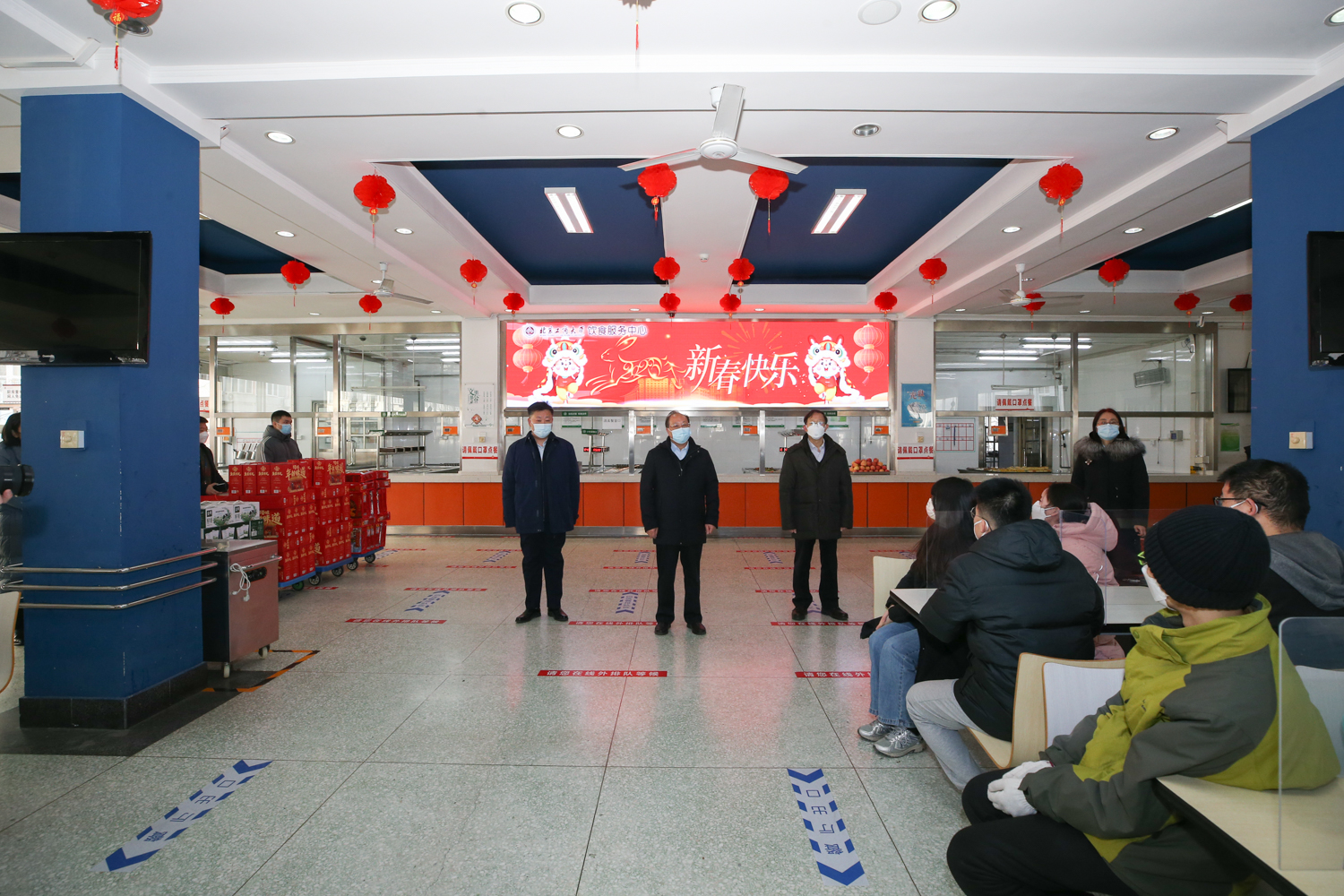 隨后,校領導一行來到東區食堂看望慰問在崗工作人員和留校學生。黃先開表示,學校將盡全力為同學們做好各方面服務保障,希望同學們在假期注意安全、勞逸結合,合理安排好自己的學習和生活,在學校度過一個愉快充實的寒假。