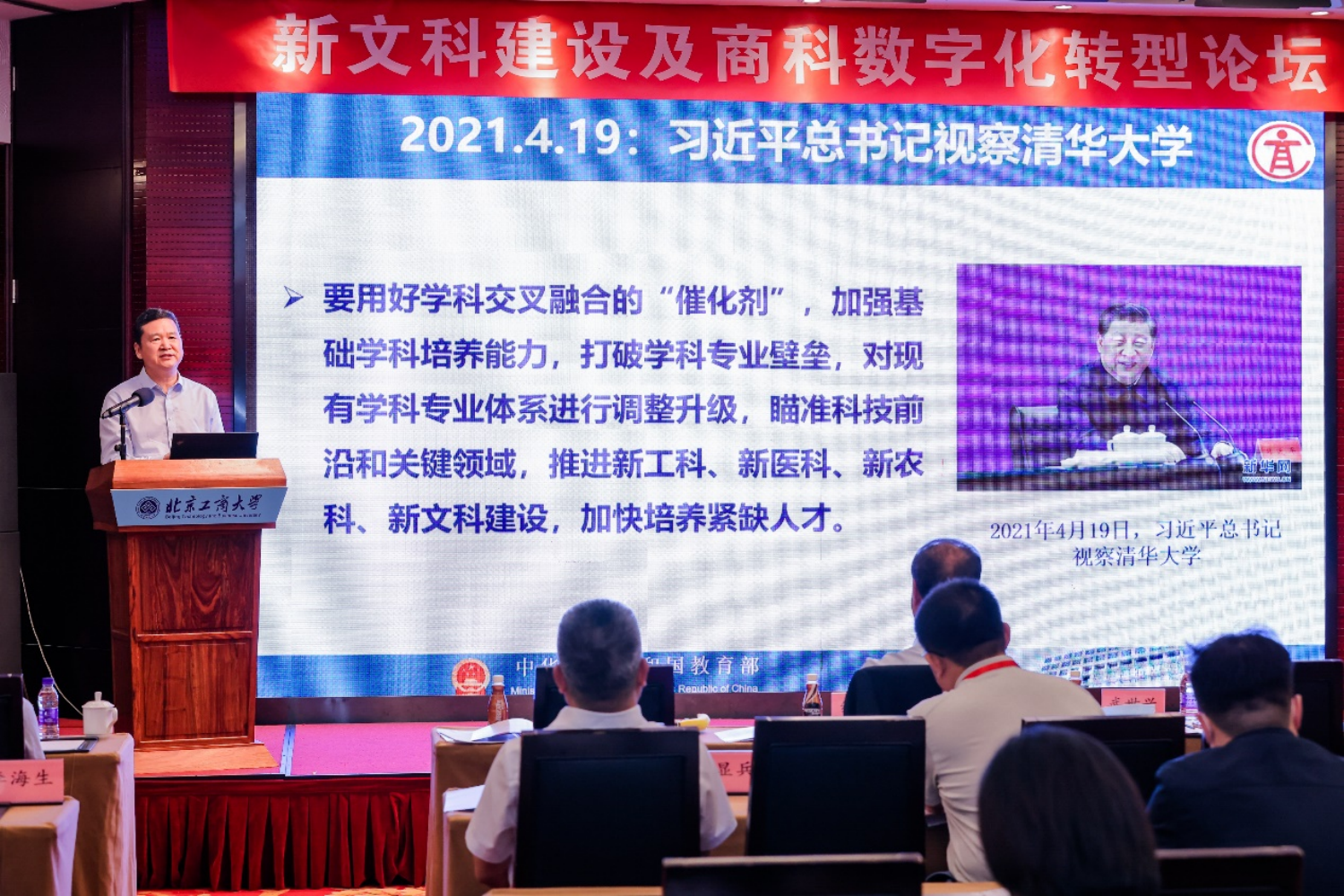 8月28日,新文科建設(shè)及商科數(shù)字化轉(zhuǎn)型論壇于線上線下同步舉行。本次論壇是在教育部、市教委相關(guān)領(lǐng)導(dǎo)的關(guān)心支持下,在中國(guó)人工智能學(xué)會(huì)、中國(guó)教育技術(shù)協(xié)會(huì)的具體指導(dǎo)下,由北京工商大學(xué)主辦,北京工商大學(xué)數(shù)字未來(lái)中心、相關(guān)學(xué)院和中國(guó)人工智能學(xué)會(huì)智能服務(wù)專委會(huì)承辦。論壇旨在順應(yīng)數(shù)字經(jīng)濟(jì)發(fā)展趨勢(shì),加快商科數(shù)字化轉(zhuǎn)型,認(rèn)真落實(shí)教育部、北京市對(duì)我校辦學(xué)的各項(xiàng)要求,以新文科建設(shè)和高等教育數(shù)字化轉(zhuǎn)型為主題開(kāi)展學(xué)術(shù)研討。論壇開(kāi)幕式由我校黨委書(shū)記黃先開(kāi)主持。