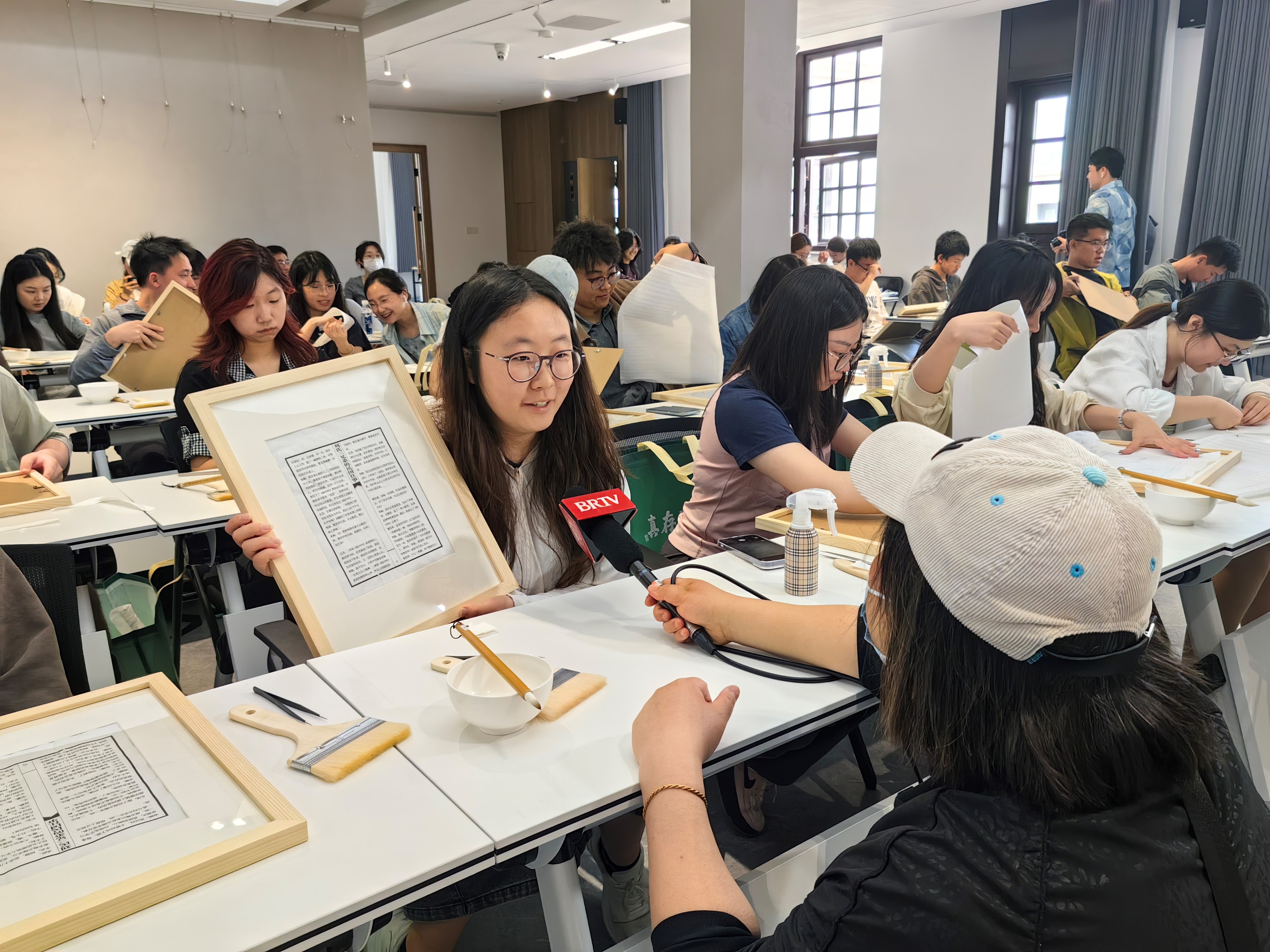 活動期間,多家新聞媒體對此次活動進行了報道。史雅祺同學(xué)在接受北京廣播電視臺采訪時表示:“這次活動讓我深刻領(lǐng)略到了非遺文化的獨特魅力,也深刻認識到這份工作對耐心和細心的極高要求。”針對“是什么吸引從業(yè)者堅守在這個崗位之上”的提問,劉慧婕同學(xué)感慨道:“他們對古籍文化懷有的強烈使命感和責(zé)任感,以及在這一非遺技藝中所展現(xiàn)出的工匠精神,正是他們堅守崗位的初心所在。”北京青年報與中國青年報的記者采訪李卓然同學(xué):作為國貿(mào)專業(yè)的學(xué)生為何會選擇參加此次活動,她談到:“我始終認為,體驗古籍修復(fù)活動讓我能夠跳出專業(yè)領(lǐng)域的局限,是一次極其寶貴的學(xué)習(xí)機會。”