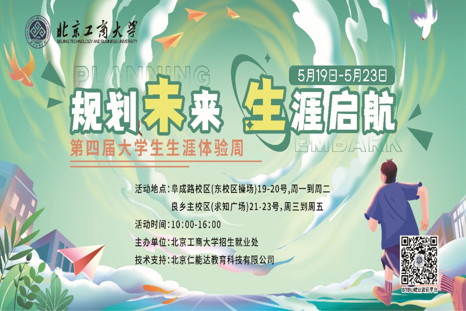 為全面落實國家對高校畢業生就業工作的指導精神,強化大學生生涯發展與職業規劃意識,5月19日至23日,我校招生就業處結合《職業生涯規劃》課程,在阜成路校區和良鄉主校區舉辦了第四屆大學生“生涯體驗周”活動。