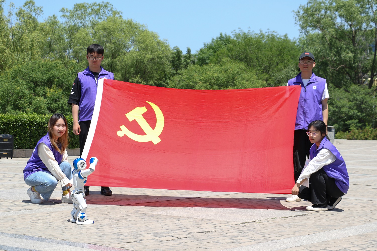 此刻,人工智能學院研發的機器人“小AI”也舉起了自己的右手,用智能語音正說著“我志愿加入中國共產黨”;同時,懸掛著黨旗的無人機編隊從人群中緩緩起飛,翱翔天空,與同學們一起向黨的百年華誕致敬。大家抬頭注視著,揮動著黨旗高喊“祝偉大的中國共產黨生日快樂”,快閃活動在同學們的歡呼聲中圓滿結束。