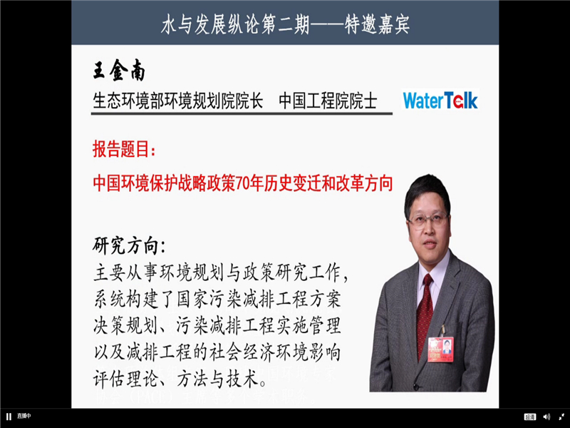 此次論壇中,王金南院士做了題為《中國環(huán)境保護戰(zhàn)略政策70年歷史變遷和改革方向》的報告。他系統(tǒng)回顧了新中國成立70年以來環(huán)境保護戰(zhàn)略政策的歷史變遷,分析了演進脈絡(luò)和階段性變化特征以及取得的成績。報告指出,我國基本建成了符合國情且較為完善的環(huán)境戰(zhàn)略政策體系,在生態(tài)文明建設(shè)和環(huán)境保護法制與體制改革、生態(tài)環(huán)境目標(biāo)責(zé)任制、生態(tài)環(huán)境市場經(jīng)濟政策體系以及多元有效的生態(tài)環(huán)境治理格局下取得了重大成就。結(jié)合新時代生態(tài)文明建設(shè)和美麗中國建設(shè)的目標(biāo)需求,王金南院士提出了未來我國生態(tài)環(huán)境保護戰(zhàn)略政策的基本走向和改革目標(biāo),并指出了管理體制、生態(tài)法治、空間管控、市場機制、公眾參與、責(zé)任考核和全球治理七大改革方向。王金南院士還與網(wǎng)絡(luò)會議室中的學(xué)者、學(xué)生進行了交流互動,耐心解答了直播平臺觀眾在討論區(qū)提出的問題。