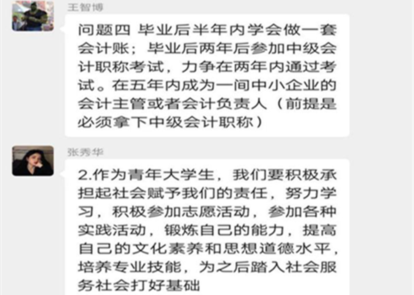 財務(wù)201、注會191、會計181等班級,在班主任老師的帶領(lǐng)和班委們的精心組織下,線上舉行了“同心戰(zhàn)役”主題班會;注會171則采用了線上平臺和微信群相結(jié)合的方式,同學(xué)們通過線上共享,集體觀看了《全國抗擊新冠肺炎疫情表彰大會》的視頻,并且圍繞中國速度、中國力量、中國精神發(fā)表了自己的感想。線上班會氣氛活躍,同學(xué)們積極分享、暢所欲言,班主任老師及時總結(jié),給同學(xué)們指引方向。