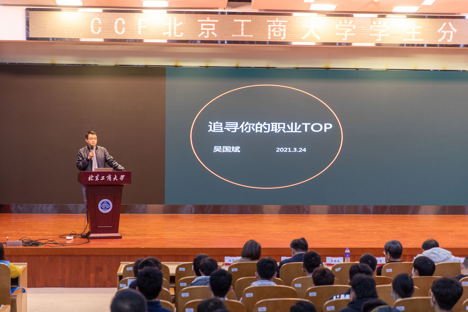 3月24日下午,計算機(jī)學(xué)院在良鄉(xiāng)校區(qū)舉辦中國計算機(jī)學(xué)會(CCF)北京工商大學(xué)學(xué)生分會“學(xué)習(xí)與職業(yè)生涯規(guī)劃”專題活動。CCF(中國計算機(jī)學(xué)會,以下簡稱CCF)秘書長、中科院計算所研究員、博士生導(dǎo)師唐衛(wèi)清博士,CCF會員與分部工作委員會主任、滴滴出行科技生態(tài)與發(fā)展總監(jiān)吳國斌博士到現(xiàn)場作專題報告。我校黨委書記黃先開出席活動,計算機(jī)學(xué)院黨委書記蔡強(qiáng),執(zhí)行院長李海生,CCF北京工商大學(xué)學(xué)生分會指導(dǎo)委員會主任陳誼,學(xué)院副院長譚勵、劉瑞軍,副書記楊秀萍,以及計算機(jī)學(xué)院本科和研究生200余人參加了本次活動。活動由CCF北京工商大學(xué)學(xué)生分會主席梁義珂主持。