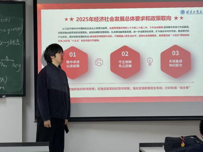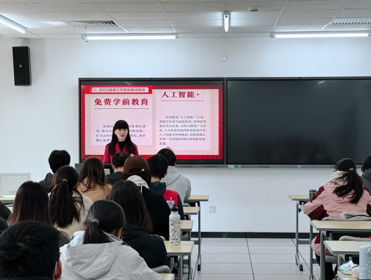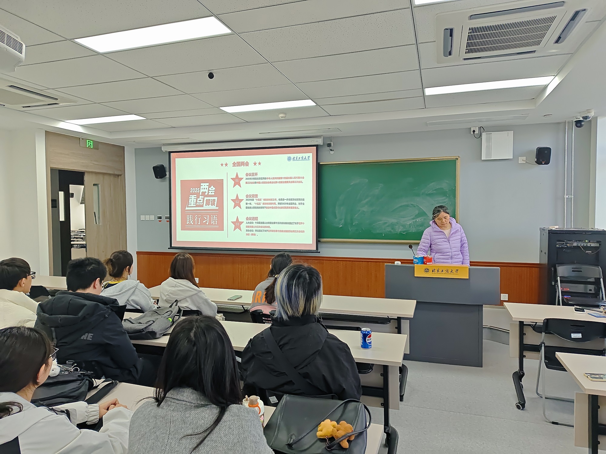 在兩會(huì)精神學(xué)習(xí)篇,班主任帶領(lǐng)各班學(xué)生,結(jié)合政府工作報(bào)告中的“制造強(qiáng)國(guó)”“教育強(qiáng)國(guó)”“人工智能+”等關(guān)鍵詞,向同學(xué)們解讀了2025年全國(guó)兩會(huì)精神。經(jīng)濟(jì)學(xué)院、商學(xué)院與數(shù)字書(shū)院各班聚焦兩會(huì)提出的高質(zhì)量發(fā)展與新質(zhì)生產(chǎn)力,引導(dǎo)學(xué)生關(guān)注國(guó)家經(jīng)濟(jì)布局,深入思考未來(lái)發(fā)展方向。輕工科學(xué)與工程學(xué)院各班圍繞“制造強(qiáng)國(guó)”戰(zhàn)略,鼓勵(lì)同學(xué)們主動(dòng)探究如何以專業(yè)能力服務(wù)國(guó)家戰(zhàn)略需求。法學(xué)院、食品與健康學(xué)院、計(jì)算機(jī)與人工智能學(xué)院各班分別圍繞法治建設(shè)、健康中國(guó)與“人工智能+”等主題,通過(guò)分組討論和專題研討相結(jié)合,引導(dǎo)學(xué)生將個(gè)人未來(lái)發(fā)展與國(guó)家需求緊密結(jié)合。數(shù)學(xué)與統(tǒng)計(jì)學(xué)院各班重點(diǎn)學(xué)習(xí)了數(shù)字經(jīng)濟(jì)和教育數(shù)字化,提高了學(xué)生對(duì)數(shù)字化轉(zhuǎn)型重要性的認(rèn)識(shí)。語(yǔ)言與傳播學(xué)院各班深入探討了“人工智能+語(yǔ)言服務(wù)”的創(chuàng)新路徑和未來(lái)發(fā)展趨勢(shì)。設(shè)計(jì)與藝術(shù)學(xué)院圍繞鄉(xiāng)村振興與綠色發(fā)展主題,引導(dǎo)學(xué)生從兩會(huì)政策中把握時(shí)代方向,增強(qiáng)服務(wù)首都四個(gè)中心建設(shè)的主動(dòng)性與責(zé)任感。