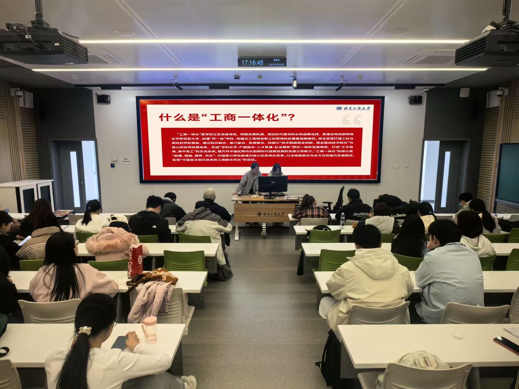 在“工商一體化”學(xué)習(xí)篇,班主任帶領(lǐng)學(xué)生簡(jiǎn)要回顧了校史,引導(dǎo)學(xué)生認(rèn)識(shí)到學(xué)校具有“工+商”的天然獨(dú)特優(yōu)勢(shì),為學(xué)生逐一介紹了“工商一體化”的內(nèi)涵、目標(biāo)、核心和必要性,并結(jié)合杰出校友和畢業(yè)生就業(yè)的經(jīng)典案例,進(jìn)一步引導(dǎo)學(xué)生深化對(duì)“工商一體化”的認(rèn)識(shí),增強(qiáng)學(xué)科交叉意識(shí)和創(chuàng)新精神,進(jìn)一步強(qiáng)化了青年學(xué)子的使命擔(dān)當(dāng),將個(gè)人發(fā)展與學(xué)校事業(yè)、國(guó)家需求緊密結(jié)合起來(lái),為學(xué)校“雙一流”學(xué)科創(chuàng)建和高水平研究型大學(xué)建設(shè)貢獻(xiàn)力量,在以中國(guó)式現(xiàn)代化全面推進(jìn)中華民族偉大復(fù)興的篇章中書(shū)寫(xiě)青春篇章。