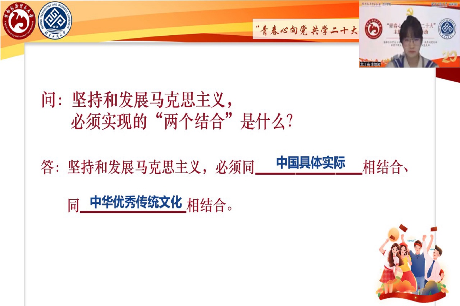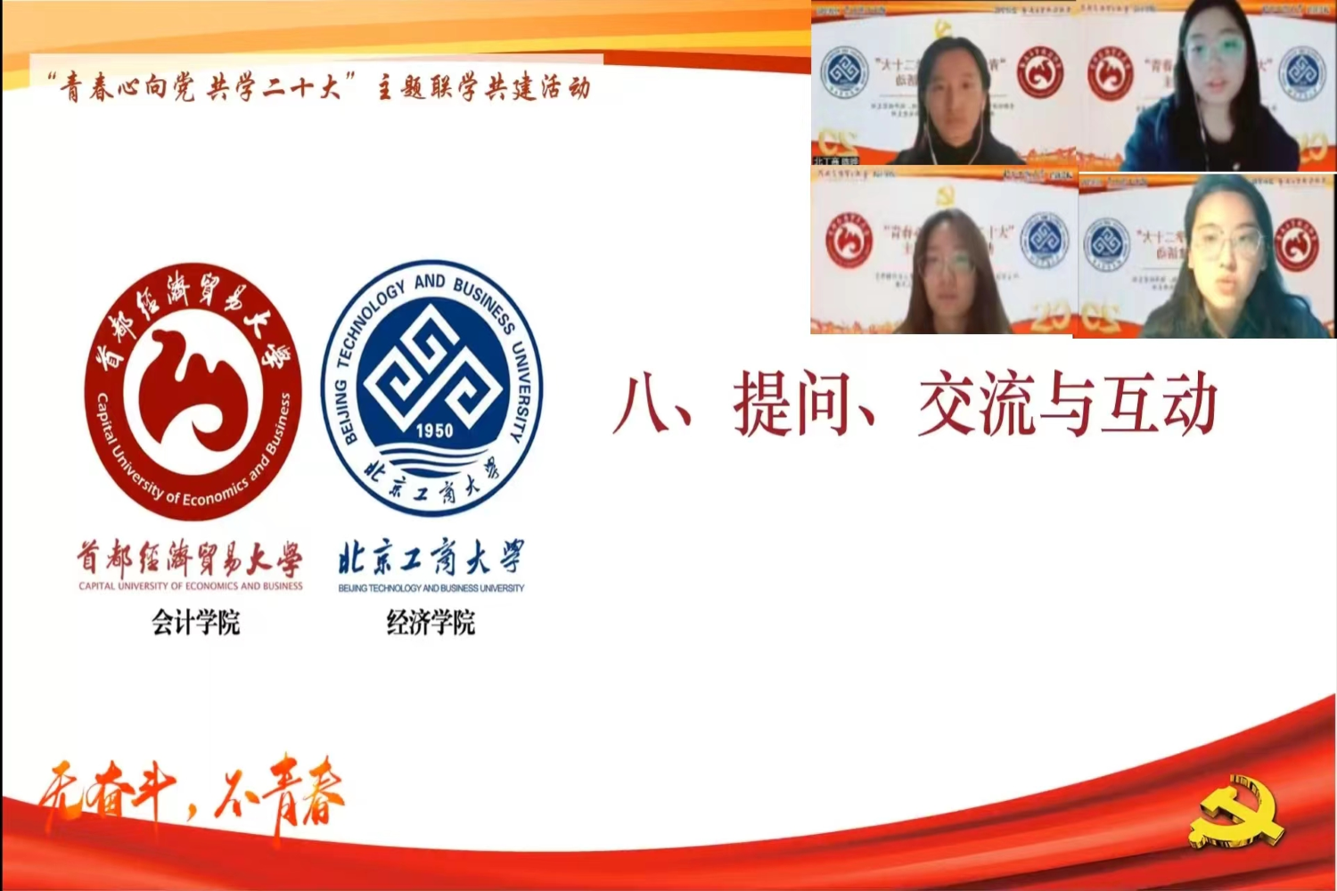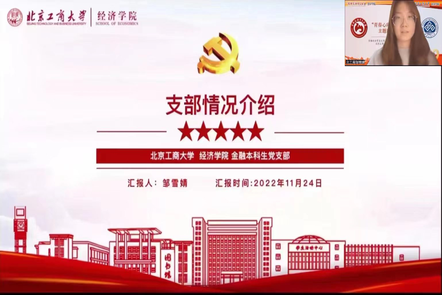 本次聯學共建活動共分為“青春獻禮二十大”和“踔厲奮發心向黨”兩個篇章。開篇,北京工商大學經濟學院金融本科生黨支部書記鄒雪婧與首都經濟貿易大學會計學院本科生高年級黨支部書記閆麗分別介紹了各支部的人員組成、主要成果與未來目標。