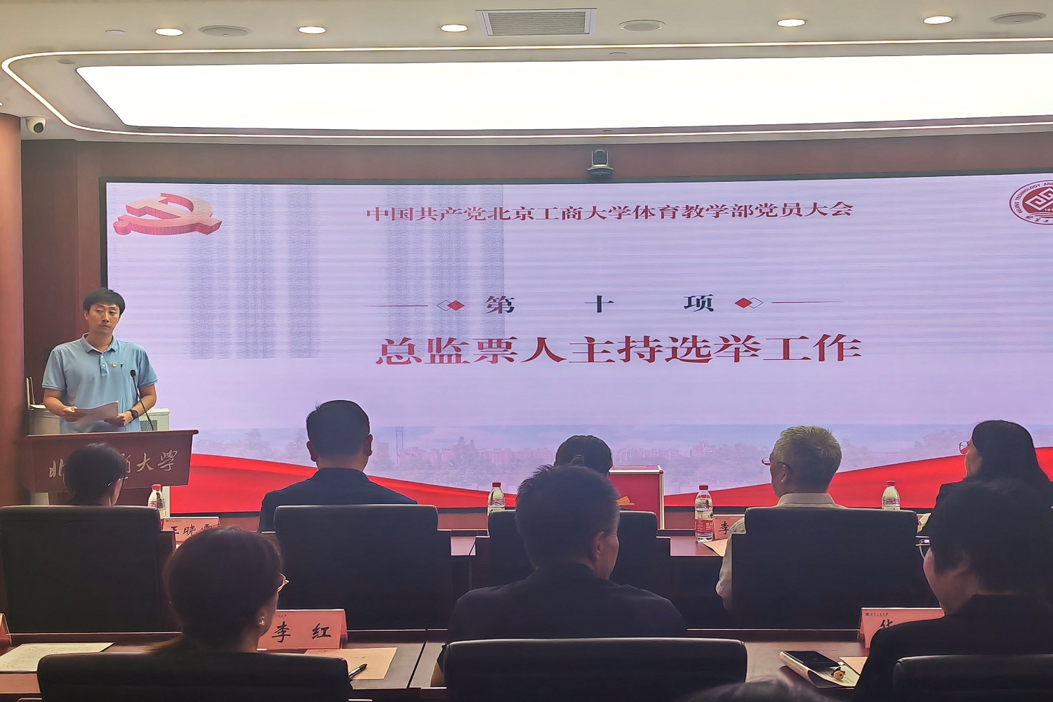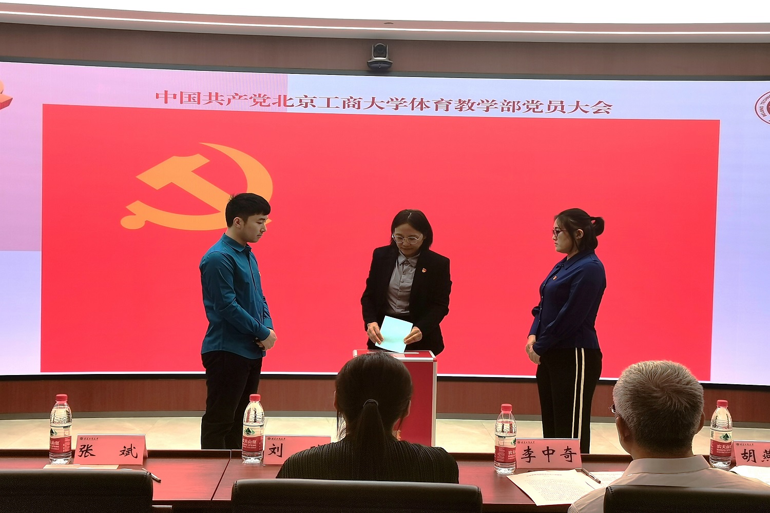 大會在雄壯的國歌聲中正式拉開帷幕。劉玢宣讀學校黨委《關于同意中國共產黨北京工商大學體育教學部委員會召開黨員大會的批復》。