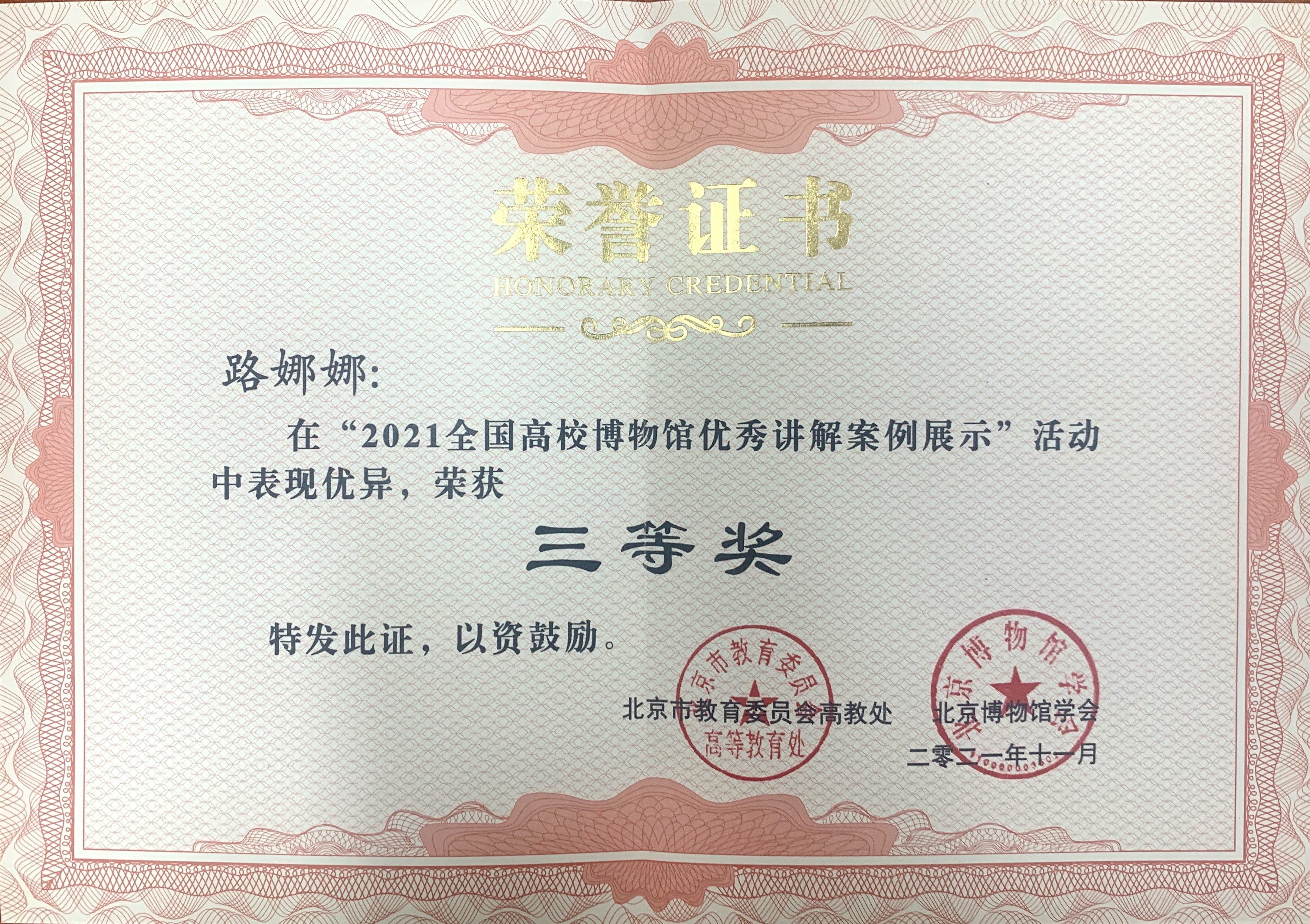 12月17日,在北京廣播大廈舉辦的“中國(guó)高校博物館論壇暨全國(guó)高校博物館優(yōu)秀講解案例展示” 活動(dòng)現(xiàn)場(chǎng),2021年度“全國(guó)高校博物館優(yōu)秀講解案例展示”活動(dòng)比賽成績(jī)揭曉,我校校史館講解團(tuán)成員路娜娜在活動(dòng)中表現(xiàn)優(yōu)異,通過(guò)生動(dòng)講述我校的紅色基因和歷史淵源,榮獲三等獎(jiǎng)。