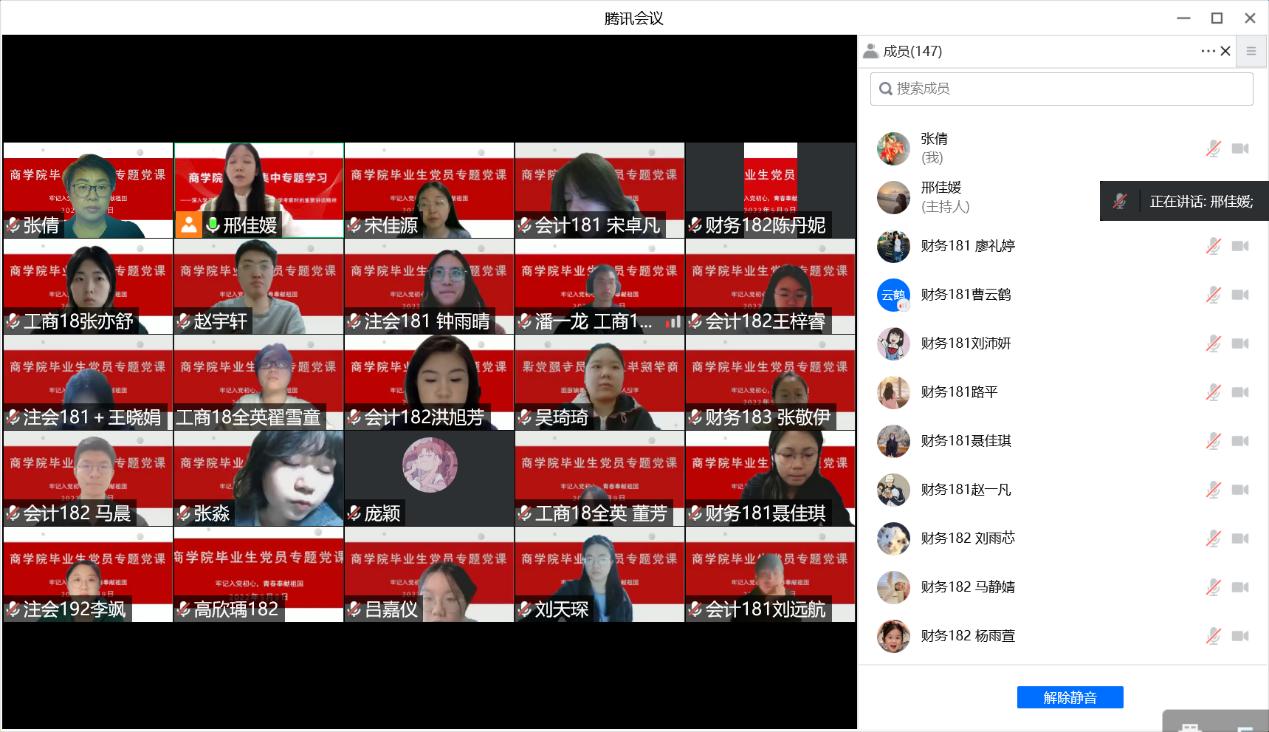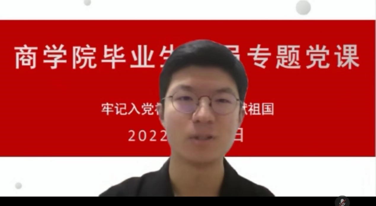 張倩為畢業(yè)生黨員講授專題黨課時表示,學(xué)校在臨時管控期間各項(xiàng)工作平穩(wěn)有序推進(jìn),感謝大家對防疫工作的支持和配合;肯定了畢業(yè)班黨員在校期間的良好表現(xiàn)及成績,希望學(xué)生黨員將在北工商求學(xué)期間形成的優(yōu)秀的品質(zhì)和良好的素養(yǎng)帶出校門、帶上崗位。她希望畢業(yè)生黨員要做到“三個牢記”,即牢記入黨的初心使命,牢記入黨誓言,牢記黨員身份;她囑咐畢業(yè)生黨員應(yīng)不斷加強(qiáng)理論學(xué)習(xí),提升黨性修養(yǎng),用理論指導(dǎo)實(shí)踐、解決問題,不斷淬煉,用行動服務(wù)人民,用青春奉獻(xiàn)祖國;她強(qiáng)調(diào)畢業(yè)生黨員應(yīng)發(fā)揮先鋒模范作用,站好最后一班崗,帶領(lǐng)周圍同學(xué)積極推動和落實(shí)就業(yè),自覺以正能量影響和帶動身邊人,文明離校;她鼓勵大家在履行防疫個人主體責(zé)任做好自我保護(hù)的同時,積極關(guān)心和幫扶家庭困難、就業(yè)困難、學(xué)業(yè)困難的同學(xué),帶領(lǐng)同學(xué)共同進(jìn)步和發(fā)展。