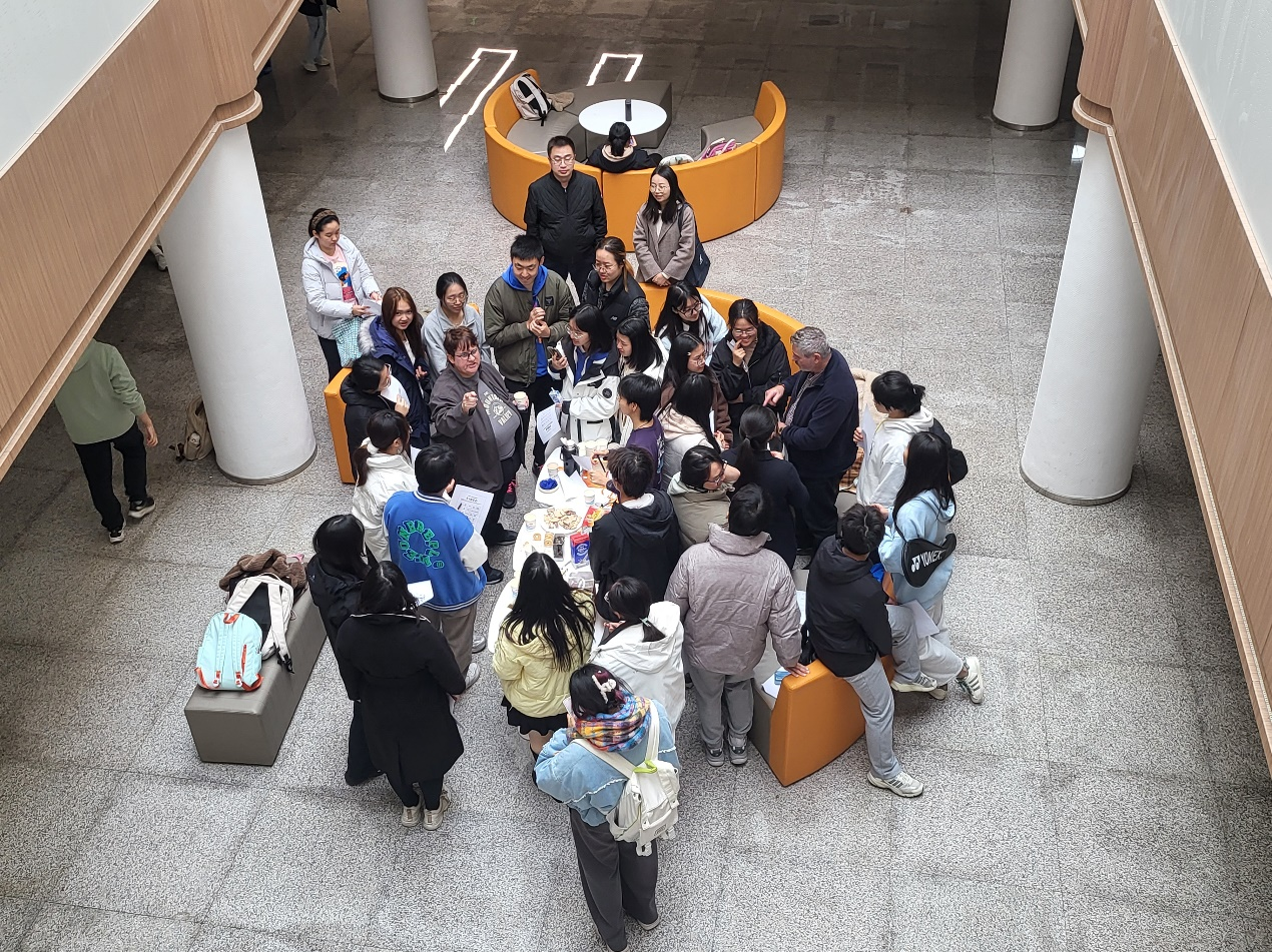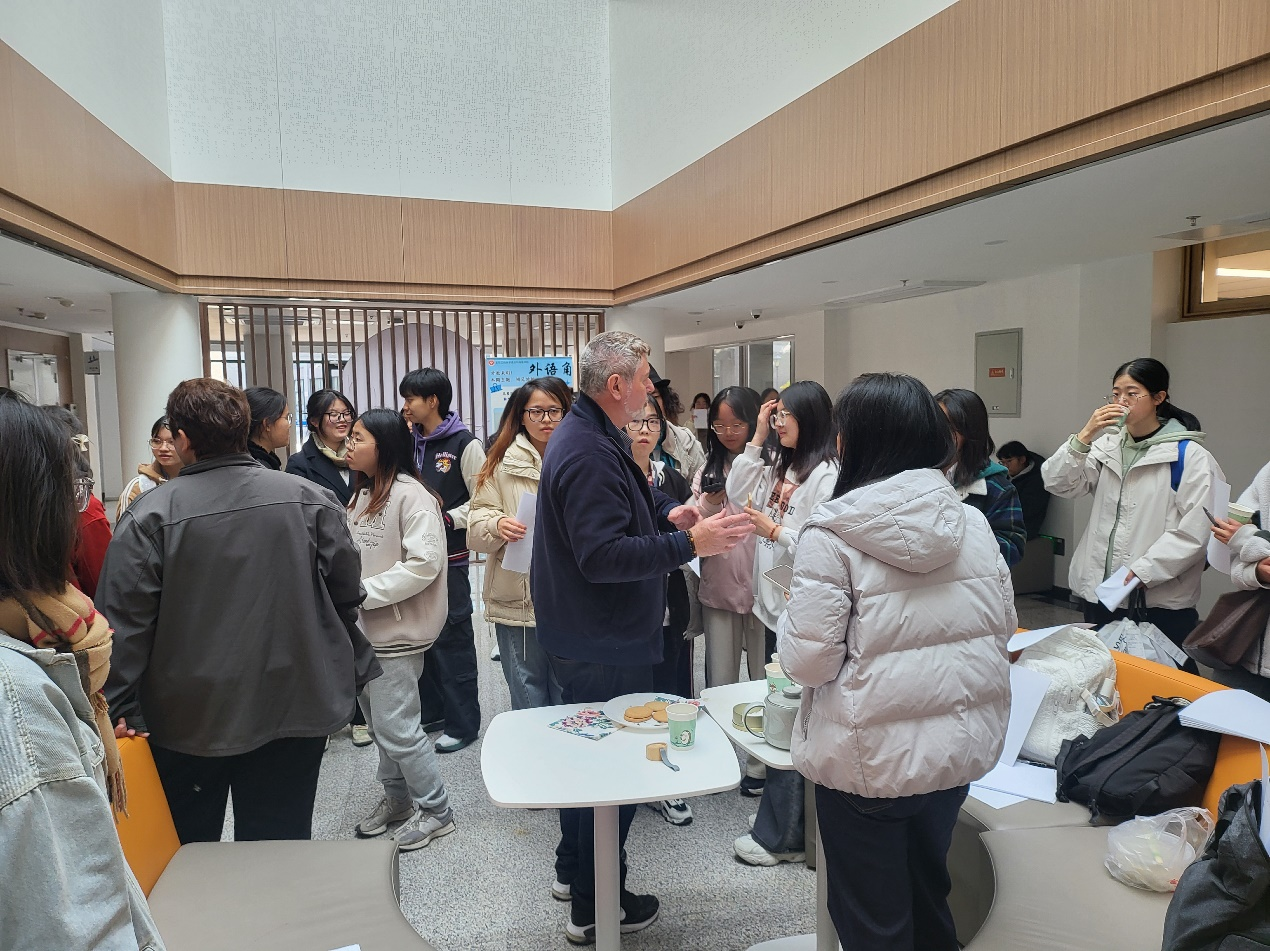 在11月6日中午舉行的首場英語角活動中,外教Tim用精致的英國茶具、英國特色的點心以及紳士范十足的英倫腔開啟了本場對話。同學們圍在Elna和Tim身邊,爭先恐后地擠到與外教交流。他們與外教交流北京印象,好奇外教來中國任教的原因,了解外教來中國前后對中國的看法變化。兩位外教侃侃而談,雙方的熱情交流拉近了彼此的距離。輕松的氛圍也使得同學們放下緊張情緒,更加大膽開口用英語交流。
