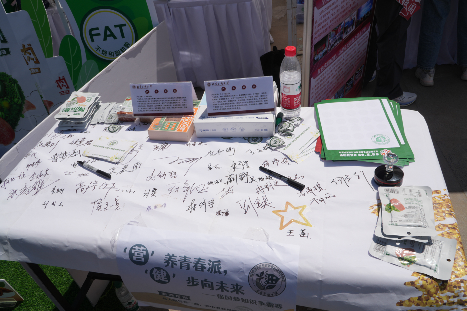 活動現場,實驗室團隊精心設計了主題互動區,包括“營養有一套”主題互動區和將健康常識轉化為趣味科普的答題區。參與者通過套圈游戲贏取實驗室自主研發的植物肉、大豆肽粉等健康產品,并參與營養知識問答,在互動中了解蛋白營養與健康益處。活動現場還展出了團隊在服務國家戰略、科技創新、人才培養及團隊建設方面取得的成果,詮釋了“鑄魂之家、創新之家、育才之家、幸福之家”的團隊理念,吸引眾多師生駐足交流。