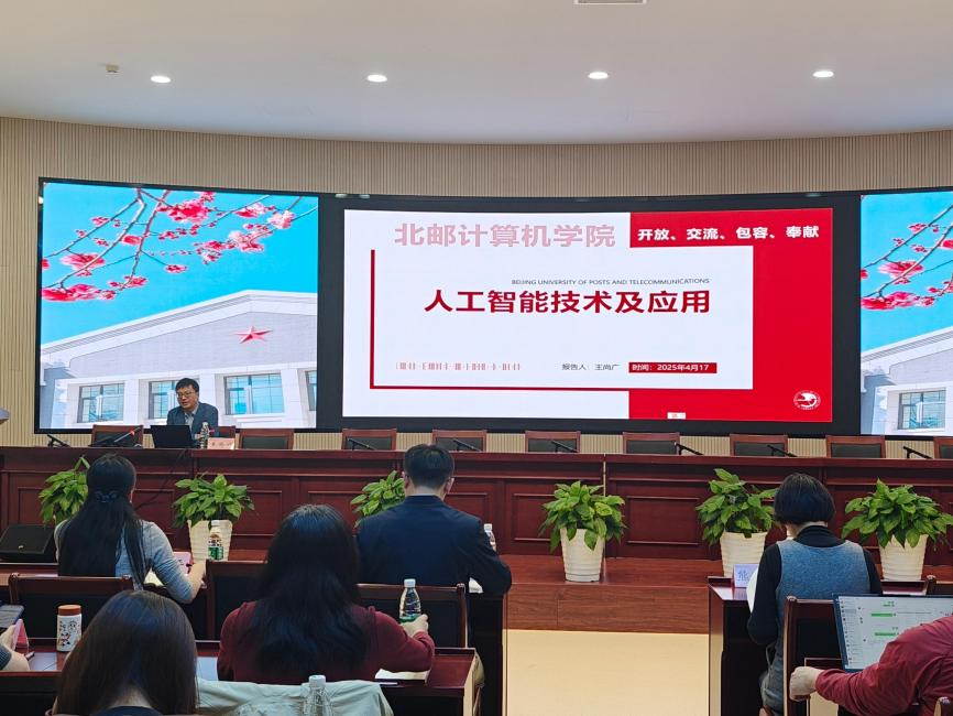 北京郵電大學計算機學院院長王尚廣教授作專題報告。他深入淺出地闡述了人工智能的基本概念和發展歷程、機器學習與深度學習、大模型通用人工智能等內容,并結合學校在思政工作中的應用,如北郵“碼上”應用平臺、思政有我工作案例、智郵心語和智慧思政等工作平臺,進行生動講解和介紹,為人工智能如何賦能學生工作提供了鮮活指南。
