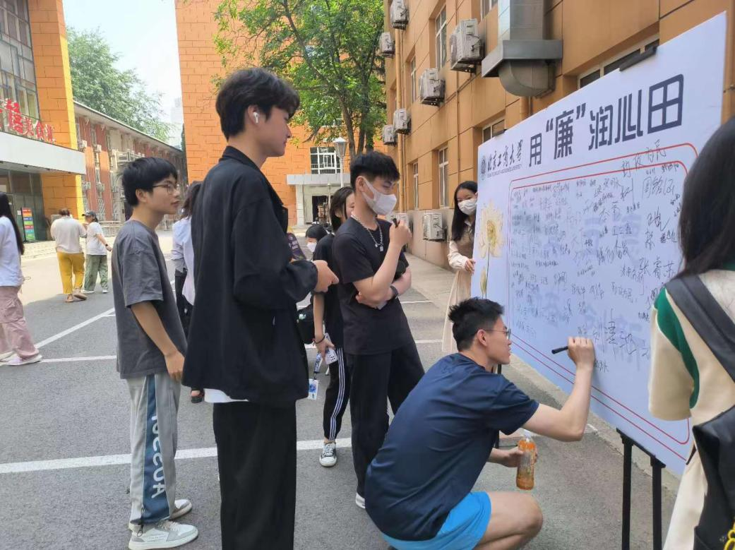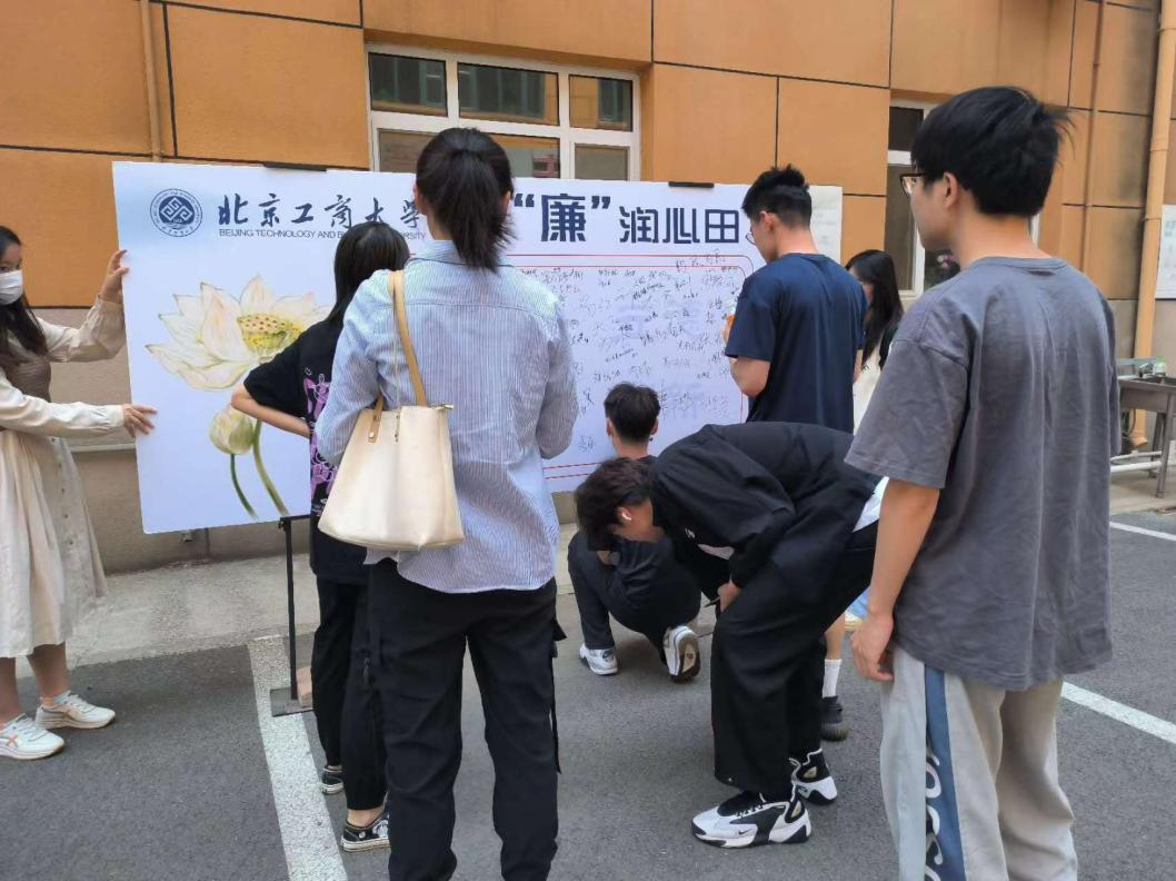 為營造良好的校園廉潔文化,商學院研究生會于5月14日11:00-13:00在阜成路西校區食堂門口舉辦“清風扶正氣 廉潔伴我行”廉潔承諾簽名活動。此次活動是商學院開展學生廉潔主題教育系列活動之一,共吸引了來自商學院、國際經管學院、輕工科學技術學院、生態環境學院等7個學院、180余名同學積極參與。