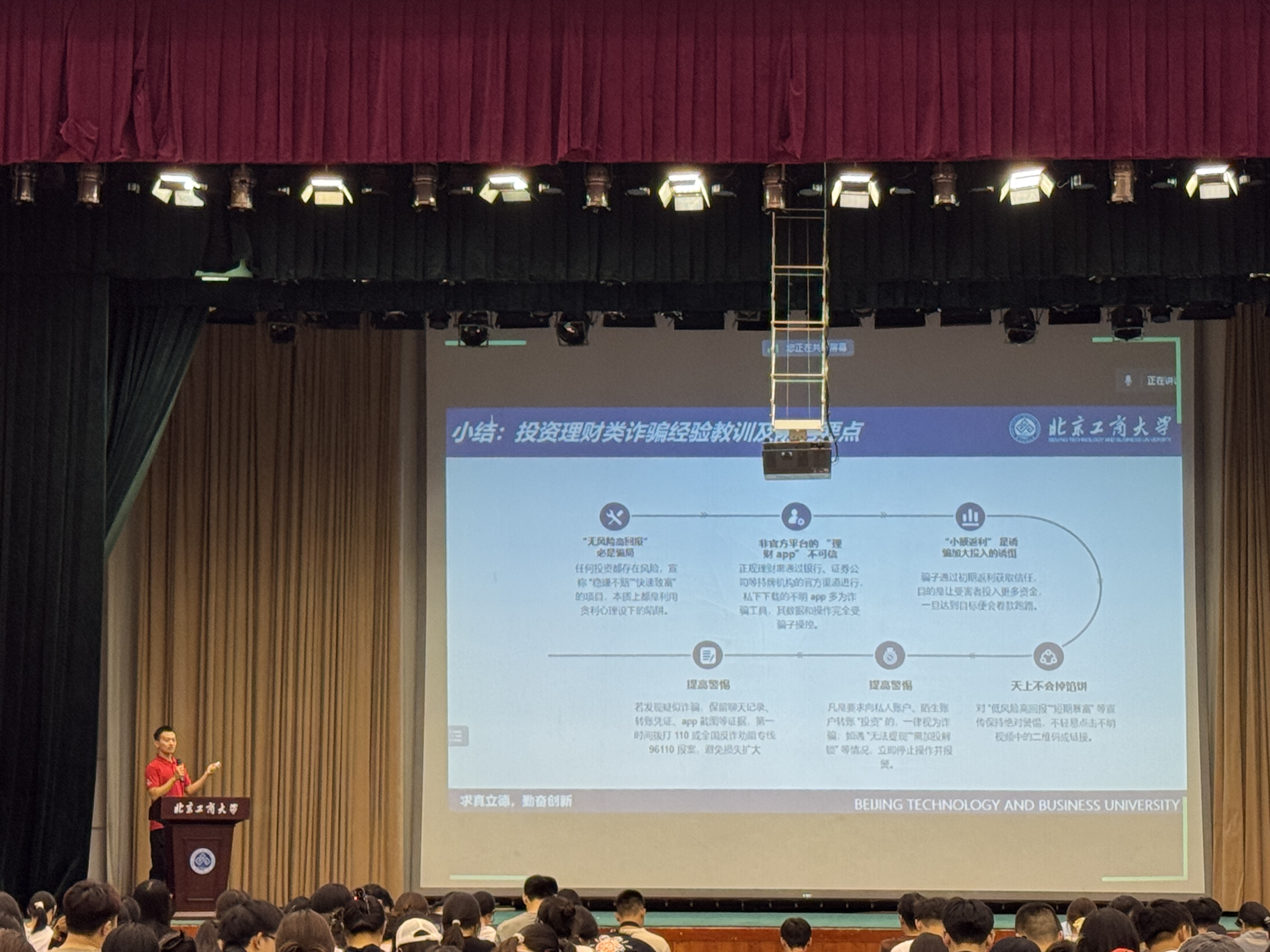 在本、研新生反詐安全教育講座過程中,6名宣講組成員分工合作,分別從電信網絡詐騙概述、高校常見電信網絡詐騙類型、我校防范電信詐騙工作開展情況、防范電信網絡詐騙應對策略四個方面進行宣講。在講解高校常見電信網絡詐騙類型環(huán)節(jié),每個案例均通過視頻和現場模擬表演短劇的形式來呈現,讓聽課學生在形象生動地短劇中“沉浸式”了解詐騙的詳細過程,為日后可能遇到的詐騙場景留下深刻印象,減少上當受騙的幾率。宣傳大使還特別有針對性地介紹了我校近三年真實發(fā)生的電詐大數據,從電詐高發(fā)類別、高發(fā)時段、高發(fā)學院、高發(fā)群體、關鍵特征等方面進行分析,讓新生既能直觀感受到電詐風險就在身邊,又清楚知道該從哪些方面進行重點防范。這種針對性強、寓教于樂的“朋輩教育”電詐教育宣傳形式,較比傳統的宣教模式在教育效果上有了很大的提升,是在高校反詐教育路徑上的積極創(chuàng)新探索,得到了上級公安部門的高度肯定。
