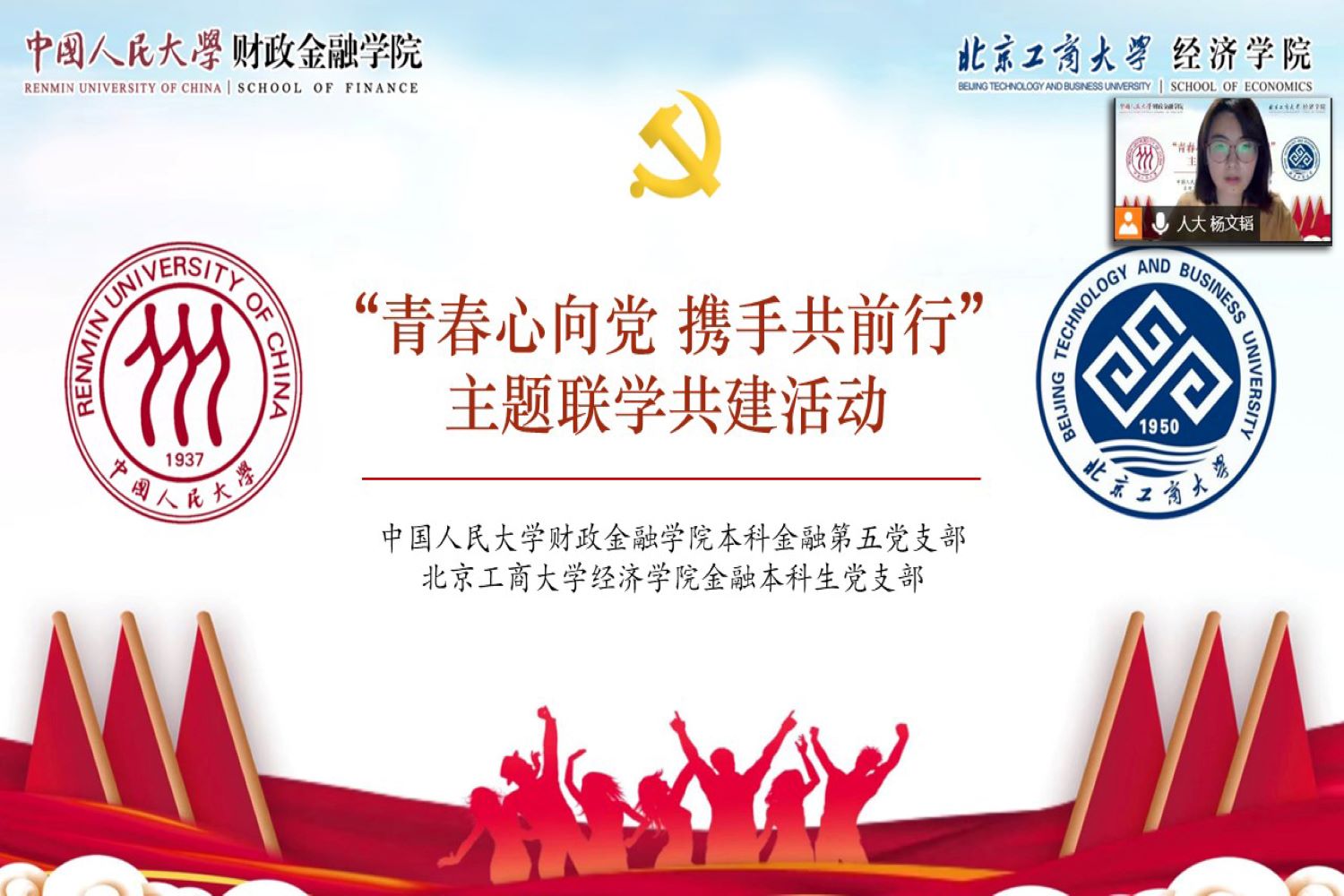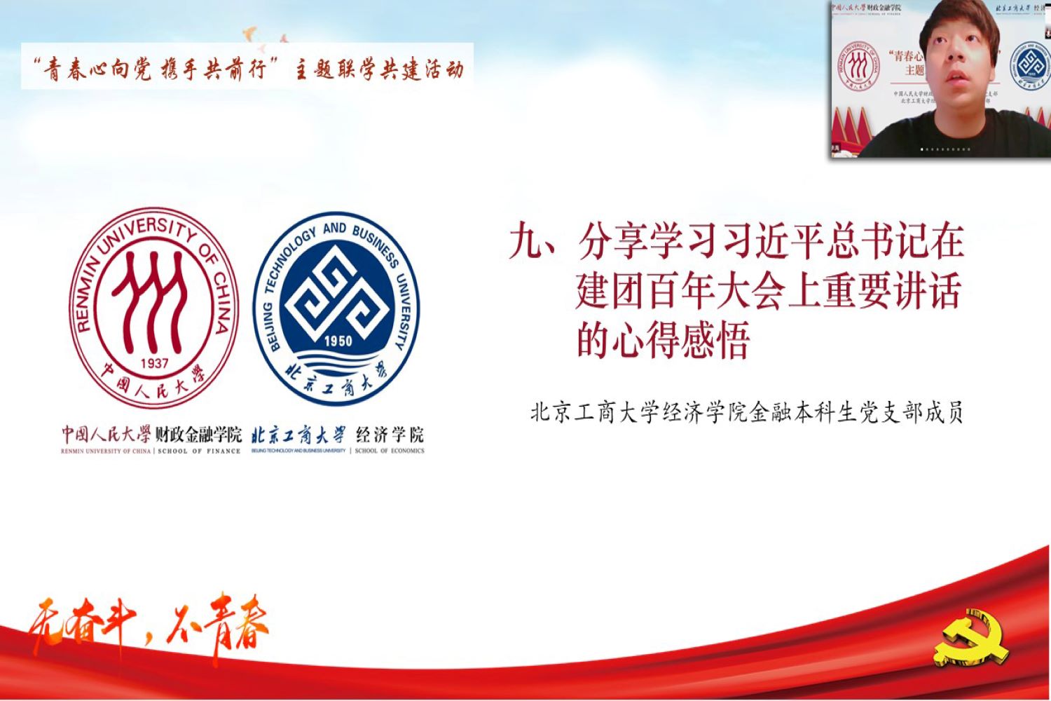 本次聯學共建活動共分為“踔厲奮發勇擔當”、“建團百年正青春”和“黨建領航聚合力”三個篇章。我校經濟學院金融本科生黨支部書記王馨笛與中國人民大學財政金融學院本科金融第五黨支部書記張奇樂分別介紹了各支部的人員組成、建設現狀與未來目標。