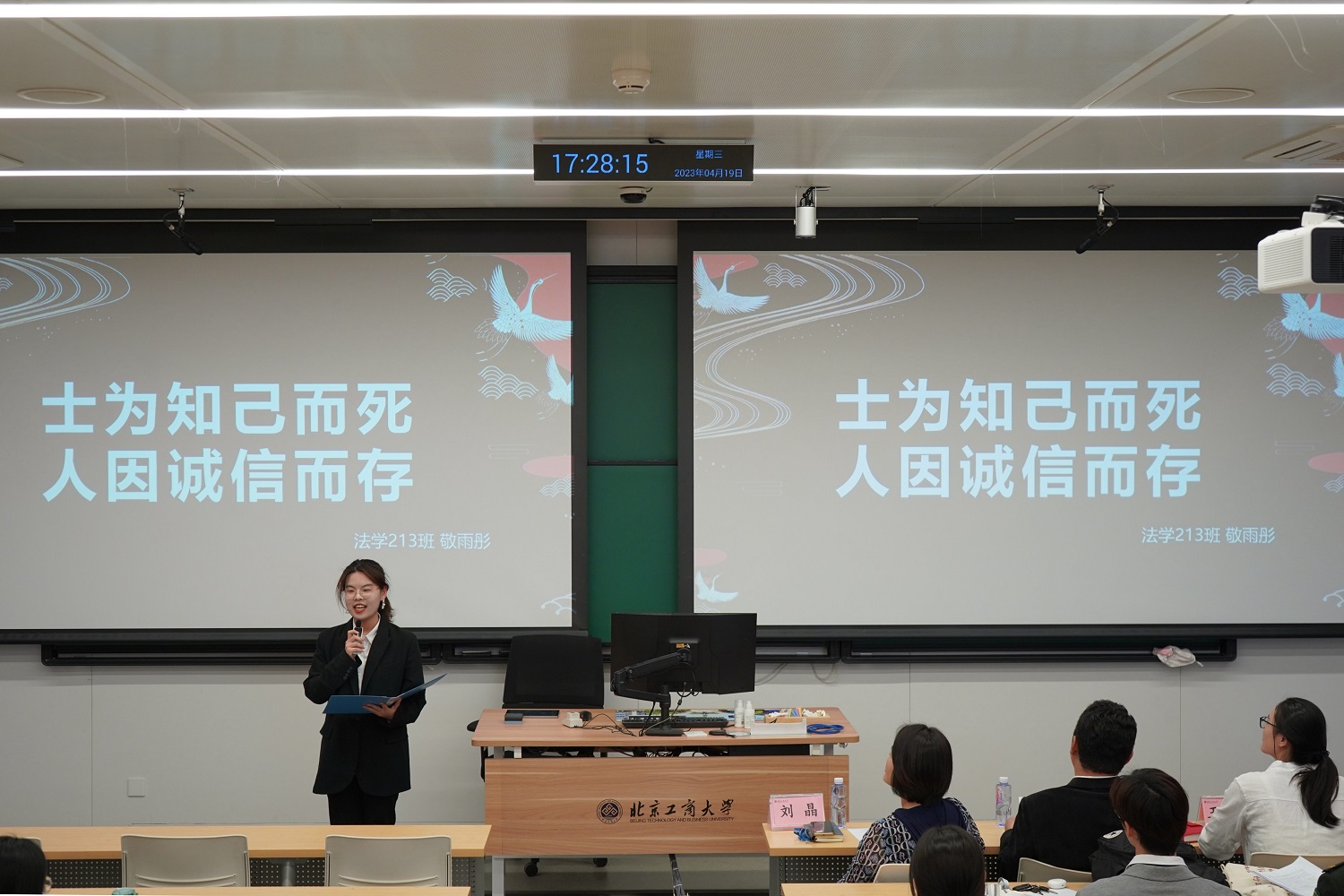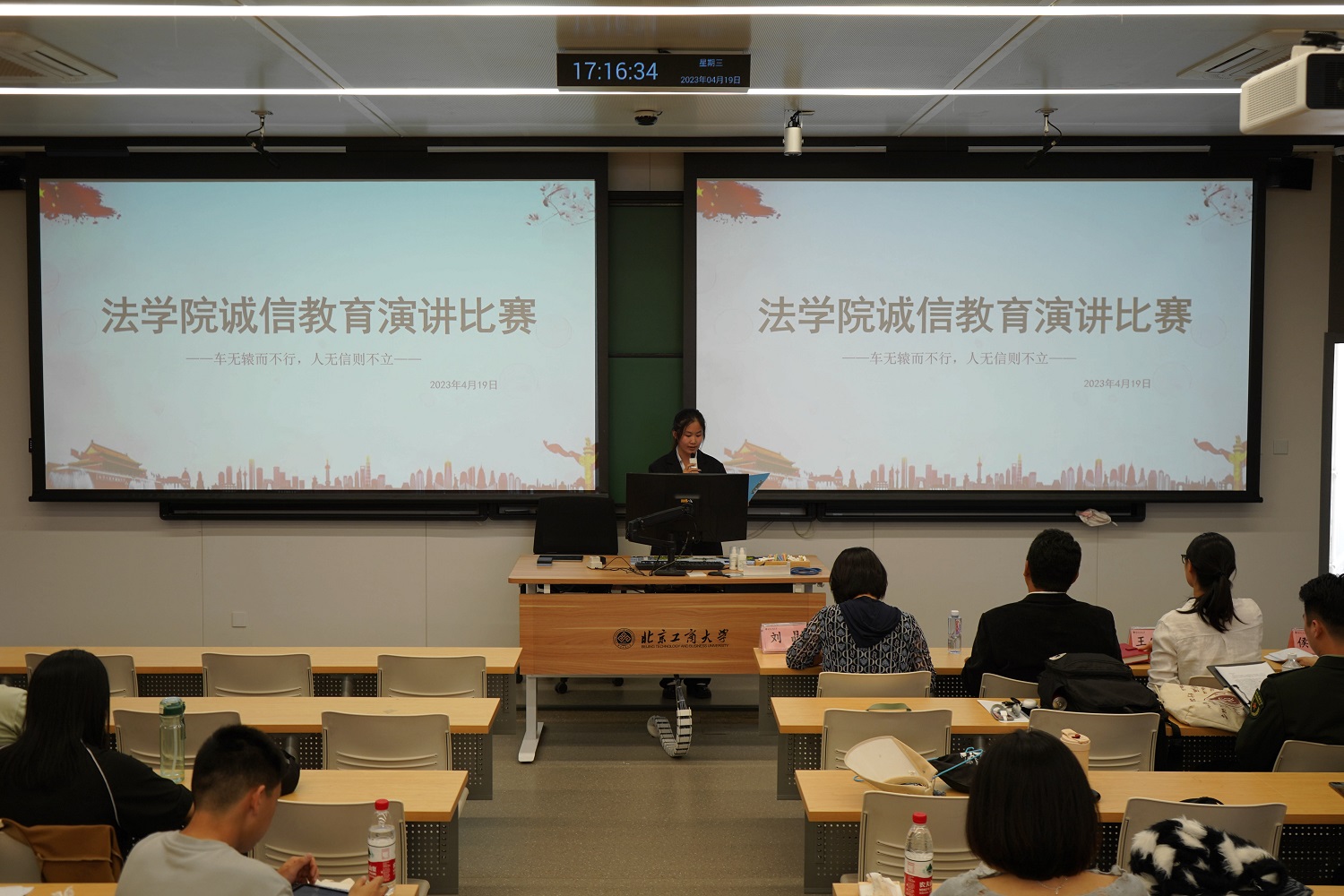 為深入學習宣傳貫徹黨的二十大精神,強化學生誠信意識,營造誠信為本的校園文化氛圍,法學院于4月19日下午舉行了誠信教育演講比賽。學院黨委副書記劉晶、團委書記王安瀾、專職組織員周升順出席比賽并擔任評委,11名同學參賽,110余名同學到場聆聽。