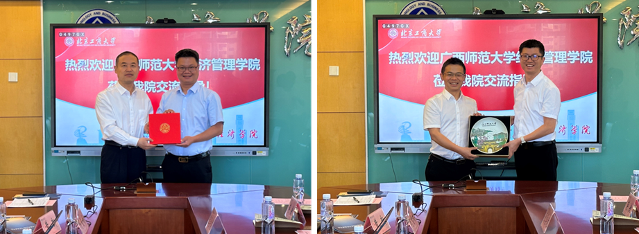 詹新宇熱忱歡迎廣西師范大學(xué)經(jīng)管學(xué)院領(lǐng)導(dǎo)班子的蒞臨指導(dǎo),介紹了北京工商大學(xué)經(jīng)濟(jì)學(xué)院發(fā)展歷程、學(xué)科建設(shè)、師資隊伍、人才培養(yǎng)等方面情況,并分享了“一個目標(biāo),三大重點,七項舉措”學(xué)院學(xué)科建設(shè)整體思路。張海豐感謝經(jīng)濟(jì)學(xué)院的熱情接待,主要介紹了廣西師范大學(xué)經(jīng)濟(jì)管理學(xué)院歷史沿革、學(xué)科建設(shè)、人才培養(yǎng)等基本情況,并分享了國際認(rèn)證的相關(guān)經(jīng)驗。
