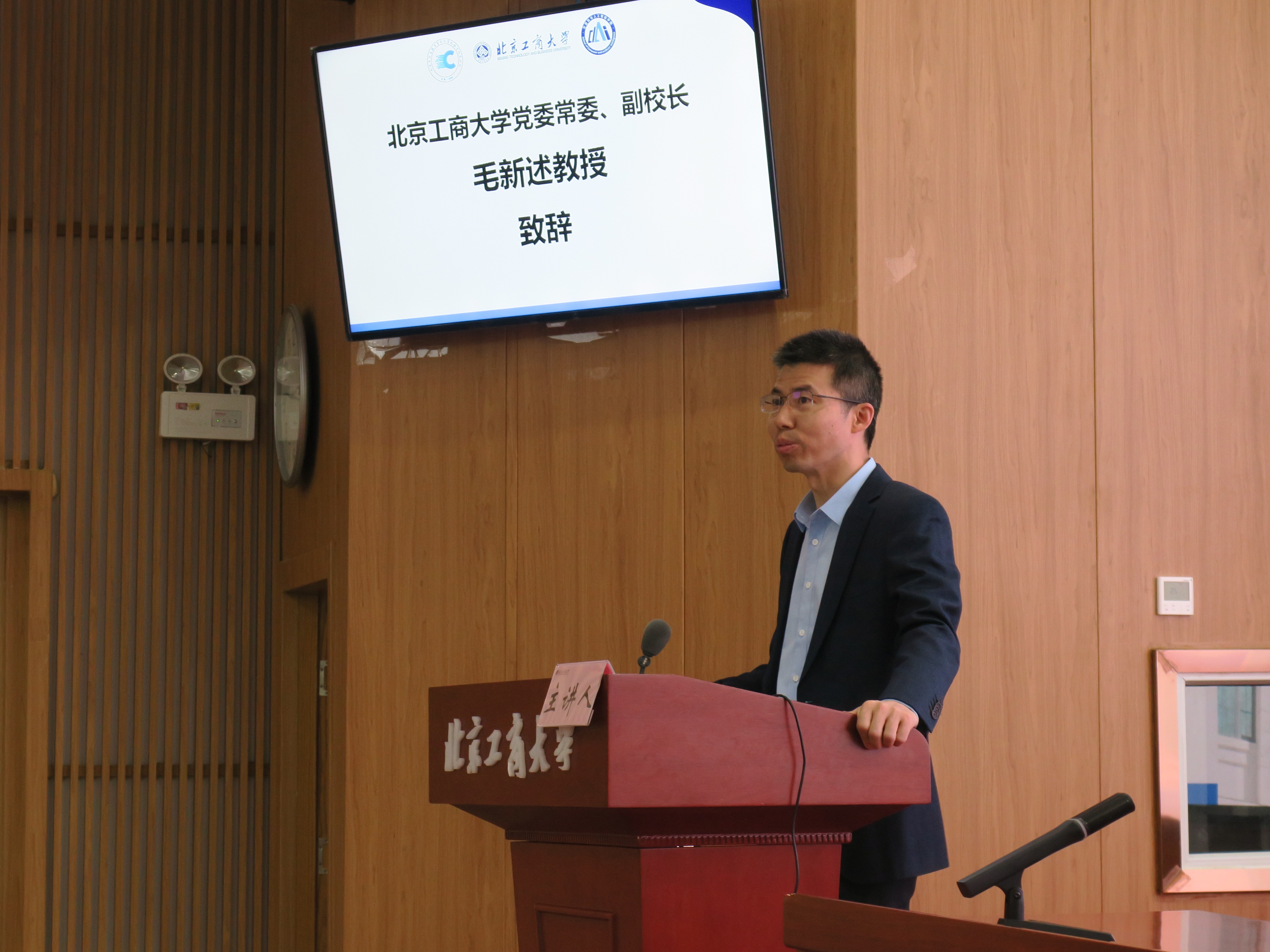 毛新述代表學校致辭。他對各位專家的到來表示熱烈的歡迎,重點介紹了我校“工商一體化”發展戰略,通過工科與商科深度融合,構建“學科交叉-產教融合-人才貫通-社會服務”協同體系,培養復合型創新人才。