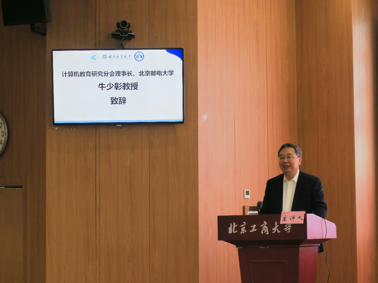 北京市高等教育學會計算機教育研究分會理事長、北京郵電大學牛少彰教授代表計算機教育研究分會致辭。他首先對今年學術年會的主題“AI賦能計算機教育創新”主題進行闡述,對我校承辦此次會議表示感謝,希望各學校代表在學術年會期間充分交流,共同提高。