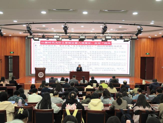 任金晶代表兩院全體師生對(duì)專家蒞臨指導(dǎo)表示熱烈歡迎,并向與會(huì)師生詳細(xì)介紹了戴立興研究員的研究方向、學(xué)術(shù)成就等情況。她強(qiáng)調(diào),此次專題講座的開展是兩院基層黨組織推進(jìn)全面從嚴(yán)治黨、加強(qiáng)黨的作風(fēng)建設(shè)的重要舉措,在全黨開展深入貫徹中央八項(xiàng)規(guī)定精神學(xué)習(xí)教育之際,此次專題講座正逢其時(shí),她希望通過本次學(xué)習(xí),全體師生黨員能夠切實(shí)提高政治站位,準(zhǔn)確領(lǐng)會(huì)中央八項(xiàng)規(guī)定及其實(shí)施細(xì)則精神的核心要義、實(shí)踐要求,堅(jiān)持學(xué)用結(jié)合,緊密聯(lián)系實(shí)際,把學(xué)習(xí)教育與落實(shí)學(xué)校“工商一體化”理念相結(jié)合,以學(xué)習(xí)教育的實(shí)績(jī)實(shí)效助推和引領(lǐng)各項(xiàng)工作高質(zhì)量發(fā)展。
