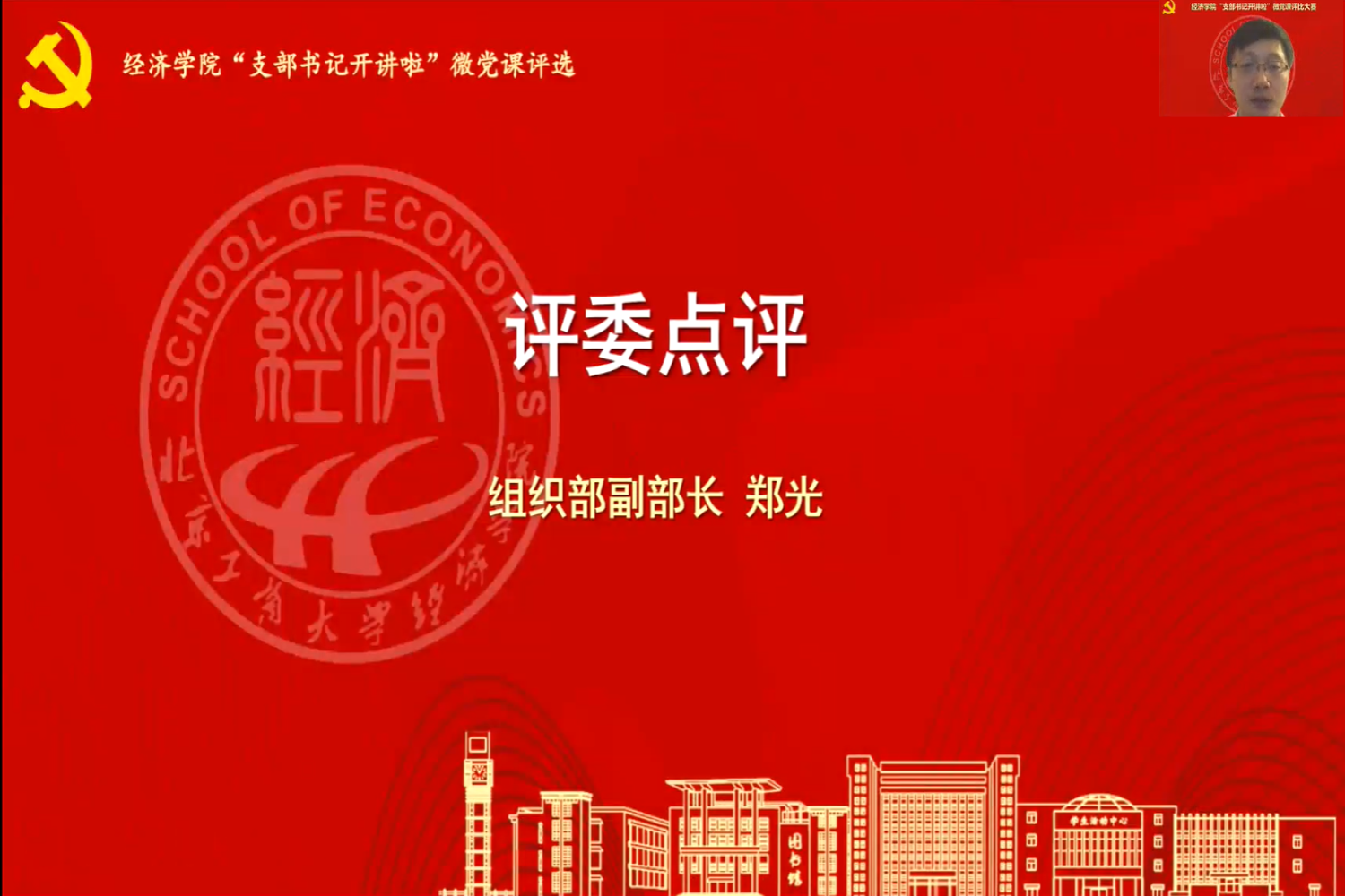 六個支部書記展示結束后,鄭光對微黨課進行點評。他表示,微黨課評比這種創新形式既克服了傳統理論知識學習所存在的枯燥問題,更豐富了學生支部建設的活動形式,是一次成功的、值得推廣的良好模式。每位同學的微黨課都足見功夫,體現了學生黨員的先進性與模范作用。希望經濟學院和各學生黨支部能繼續深化活動效果,不斷加強組織建設和理論學習,取得更大成績。