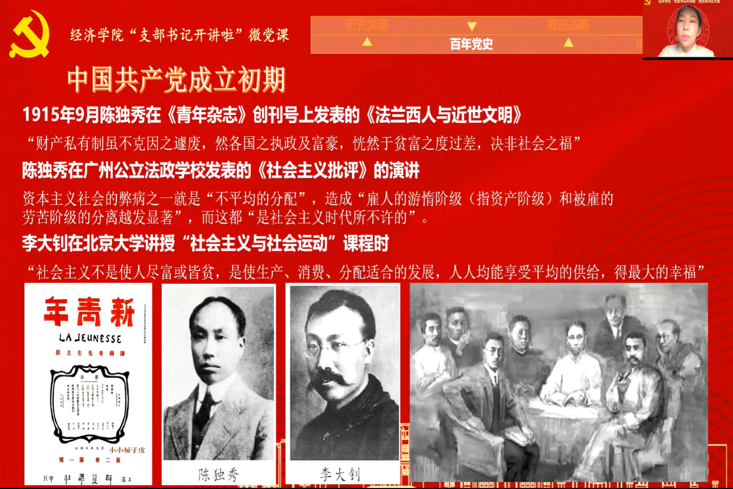 保險21級專碩黨支部書記伊鈺霞帶來微黨課的《百年黨史中的經濟發展》,她從“人民生活貧困到邁向小康”、“主要產品從空白到世界領先”和“綜合國力從衰敗到日益強盛”三部分展開,捋清百年經濟發展脈絡。伊鈺霞表示,我們要堅持以習近平新時代中國特色社會主義思想為指導,增強“四個意識”、堅定“四個自信”、做到“兩個維護”,為實現第二個百年奮斗目標、實現中華民族偉大復興的中國夢奠定堅實物質基礎。