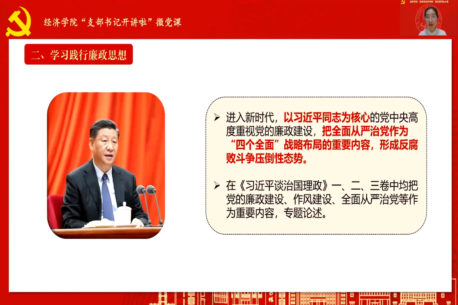 經濟本科生黨支部書記金澤豪帶來微黨課《作風紀律建設與反腐敗斗爭》。她從“銘記黨的廉政歷史”“學習踐行廉政思想”“做新時代廉潔自律的模范”三個方面展開論述。她用鏗鏘有力的話語呼吁廣大學生黨員自覺提高政治站位,嚴守紀律紅線,以良好的精神面貌、純潔的黨性修養、嚴謹的態度、優異的成績回報黨和學校的重托與期望,以擔當詮釋初心,以實干踐行使命,為學校開創特色鮮明的高水平研究型大學建設新局面貢獻一份力量!