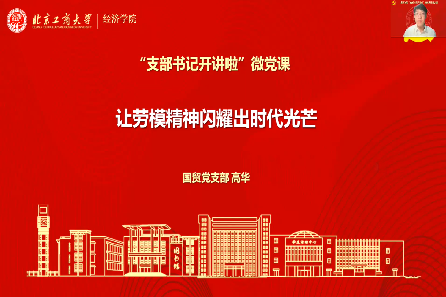國貿本科生黨支部書記高華帶來微黨課《讓勞模精神閃耀出時代光芒》。他從“勞動的意義與形式”“勞模精神的時代體現”“當代青年之踐行”三個方面分別展開講述。講述過程中,他多次和觀眾們互動,聲情并茂地詮釋了勞動的意義與內涵。最后,他呼吁廣大青年要學習勞模精神、踐行勞模精神、發揚工匠精神。