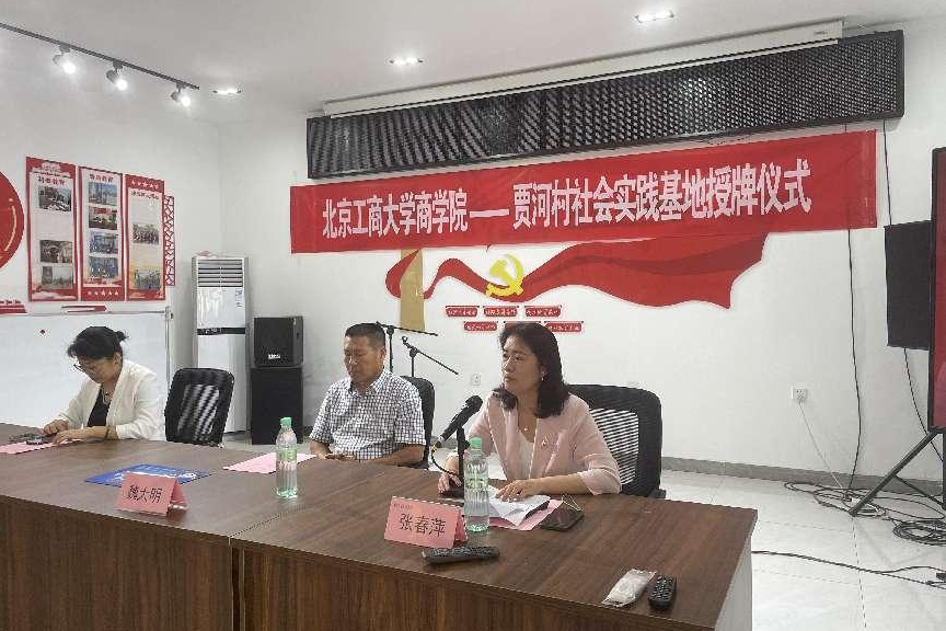 授牌儀式上,張春萍在致辭中對本次暑期社會實踐的組織、開展情況給予了高度肯定,對實踐團成員表示了充分認可。她回顧了商學院與賈河村多年來的良好合作基礎,對賈河村一直以來為商學院師生提供良好的實踐學習平臺表示衷心感謝。她講道,多年來,商學院師生通過紅色1+1黨支部共建、志愿服務、實地調研、京白梨營銷方案設計大賽、賈河村萬畝梨園營銷大賽、共謀“賈河白梨”品牌策劃方案、社會實踐等多種方式與賈河村保持著廣泛的合作與聯絡,雙方有著深厚的歷史淵源和良好的合作基礎。大學生社會實踐是教育引導學生走出校門接觸社會,使理論與實踐相結合、學以致用,培養學生分析問題與解決問題能力、了解國情、培養為民情懷、服務首都發展建設的重要途徑。相信通過社會實踐基地的授牌與建立,可以將雙方的交流與合作進一步深化,共同探索商科人才培養路徑,更有效鍛煉大學生的綜合能力,提高思想覺悟,增強服務社會的意識。她期待著與賈河村今后建立更加廣泛、深入的合作,發揮各自的優勢,積極投入鄉村振興建設,通過豐富的形式和有效的內容,打造高質量的社會實踐基地,實現學生成長發展與賈河村鄉村振興、商科人才培養“多贏”格局,共同為首都高質量發展貢獻智慧和力量。