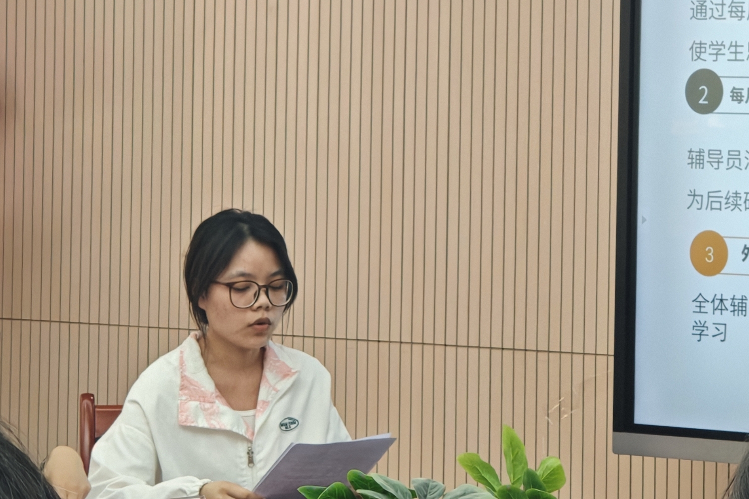 學(xué)院黨委副書記畢平平在匯報(bào)中講到,圍繞學(xué)校構(gòu)建“本業(yè)為主-主動工作-以學(xué)生為中心”學(xué)生工作體系,學(xué)院堅(jiān)持以學(xué)生需求為中心,積極探索提升輔導(dǎo)員思政引領(lǐng)力工作模式,形成涵蓋理論學(xué)習(xí)、隊(duì)伍建設(shè)、服務(wù)需求、五育并舉、網(wǎng)絡(luò)思政等五方面的能力提升行動方案。她重點(diǎn)講述00后學(xué)生的變化與輔導(dǎo)員工作能力的矛盾,隨后她就學(xué)院在提升輔導(dǎo)員思政引領(lǐng)力方面的具體探索進(jìn)行介紹,包括集體學(xué)習(xí)、協(xié)同育人、“學(xué)生議事廳”、二級心理輔導(dǎo)站以及學(xué)生活動“三大團(tuán)”,學(xué)院精品宣傳等工作亮點(diǎn)。