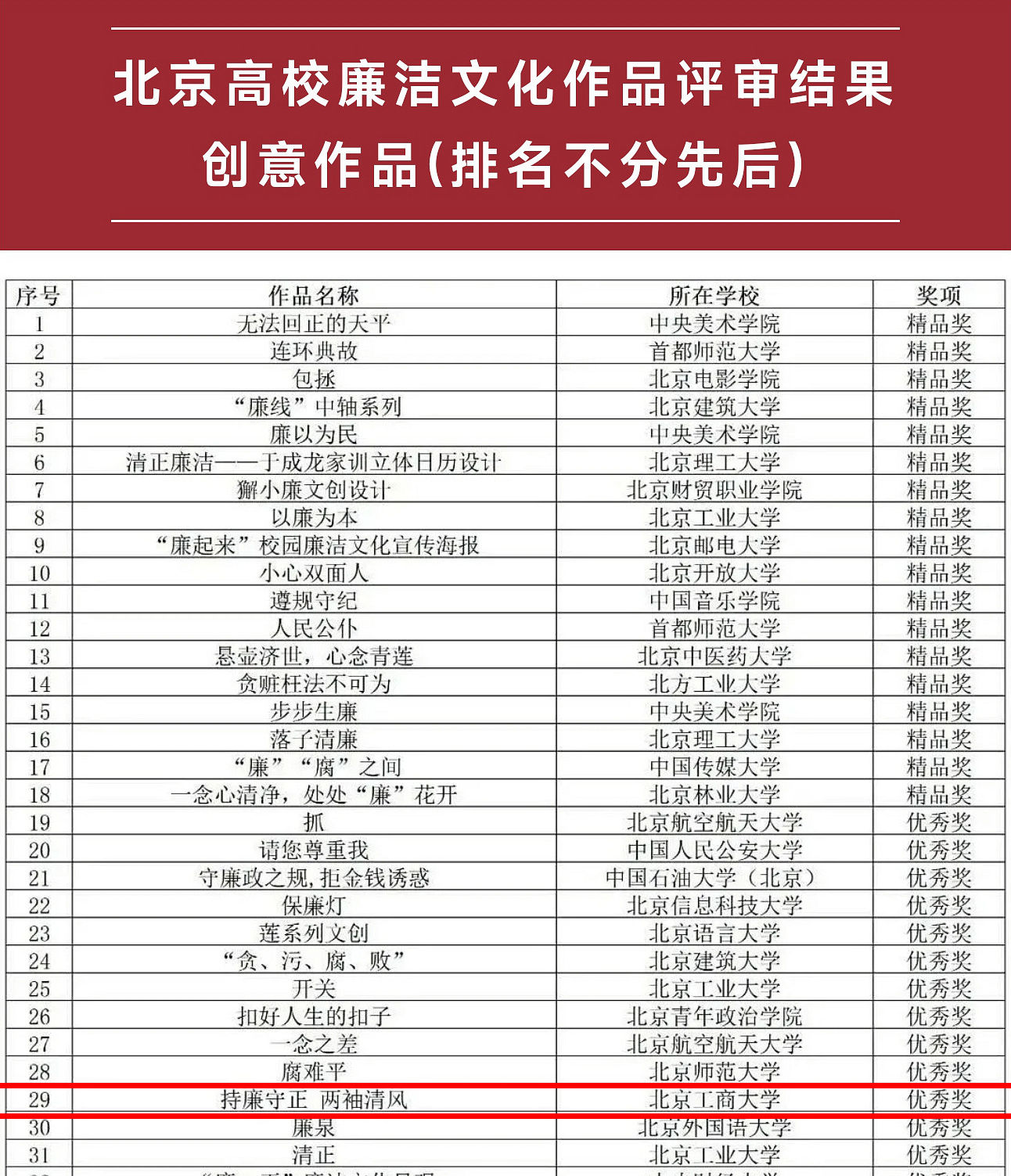 自2024年廉潔文化征集活動啟動以來,黨委宣傳部、紀檢監察綜合室等部門統籌規劃,各級黨組織認真組織,廣大師生積極參與,涌現了出一批優秀作品。經專家評審,在全校范圍內評選出一等獎、二等獎、三等獎和優秀組織獎若干。并擇優向北京市推送作品。