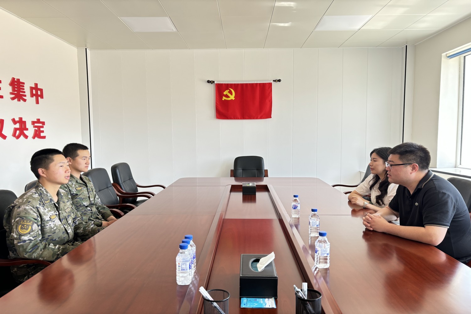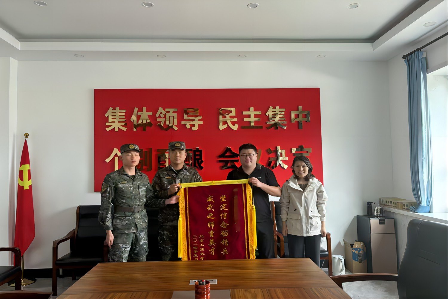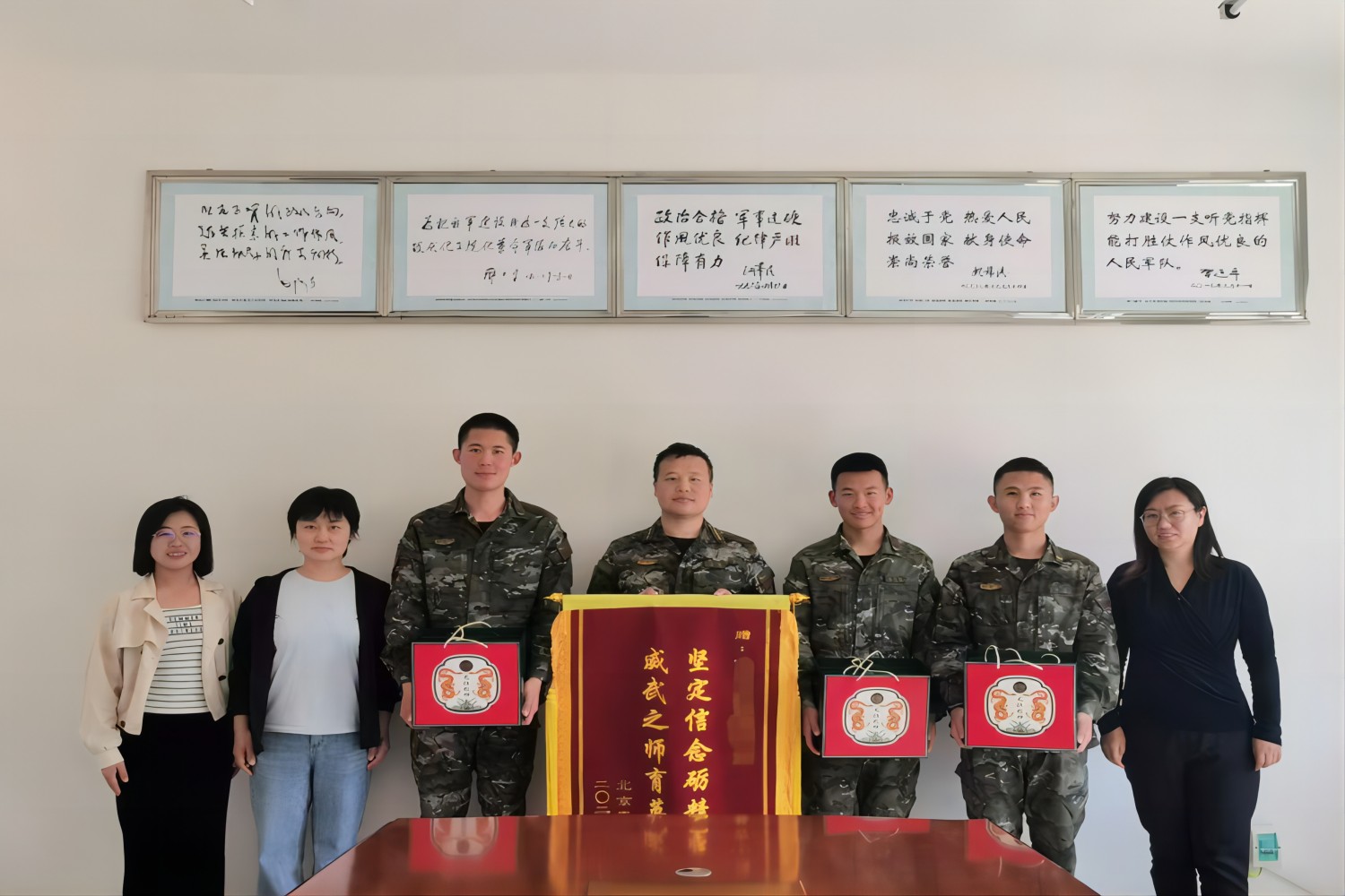 座談會(huì)結(jié)束后,慰問教師代表學(xué)校向部隊(duì)和學(xué)生贈(zèng)送了錦旗和慰問品。學(xué)生們紛紛表示一定會(huì)刻苦訓(xùn)練,忠于職守,為母校爭(zhēng)光,為祖國添彩。