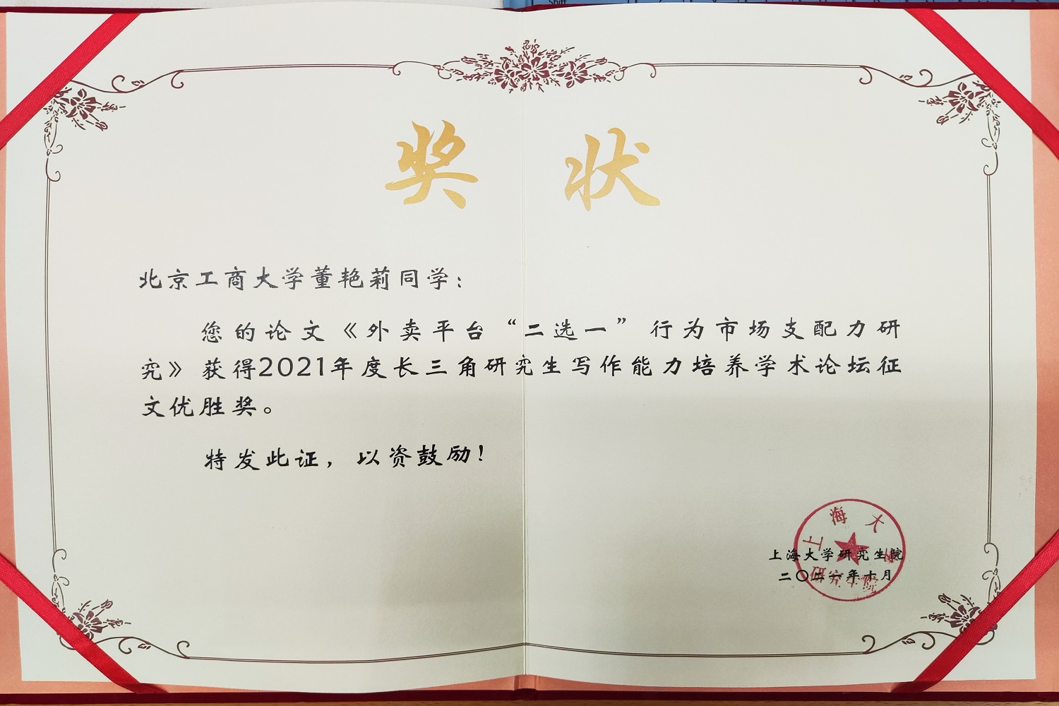 為進一步開拓研究生學術視野,綜合提高研究生寫作能力與學術素養,為長三角等區域的高校學術寫作交流與發展提供高質量的學術交流平臺,10月29日,第二屆長三角研究生寫作培養學術論壇在上海舉辦。該論壇由上海市教育委員會主辦,上海大學研究生院、上海大學圖書館、上海大學外國語學院承辦。我校法學院研究生董艷莉的論文獲評征文優勝獎。