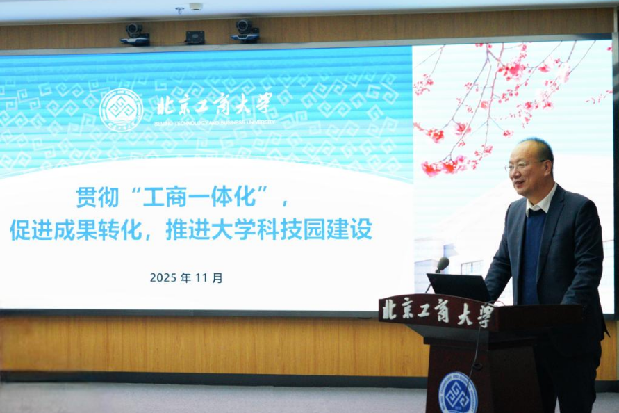 錢立軍代表科管辦以“貫徹工商一體化,促進成果轉化,推進大學科技園建設”為主題進行匯報,詳細介紹了大學科技園建設的整體框架、建設思路、企業入孵程序等工作。他強調,大學科技園是鏈接創新與產業的關鍵橋梁,更是學校服務國家戰略和區域經濟發展的重要平臺,學校將以此為驅動,有力推動科技成果轉化,不斷激發學科建設與科技創新活力,為國家科技發展、實現高水平科技自立自強貢獻北工商力量。